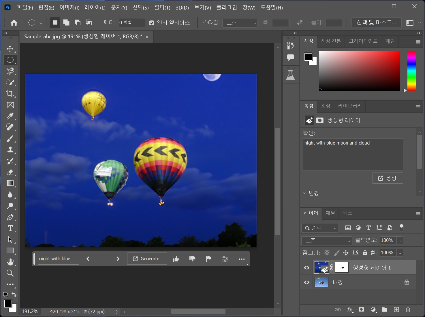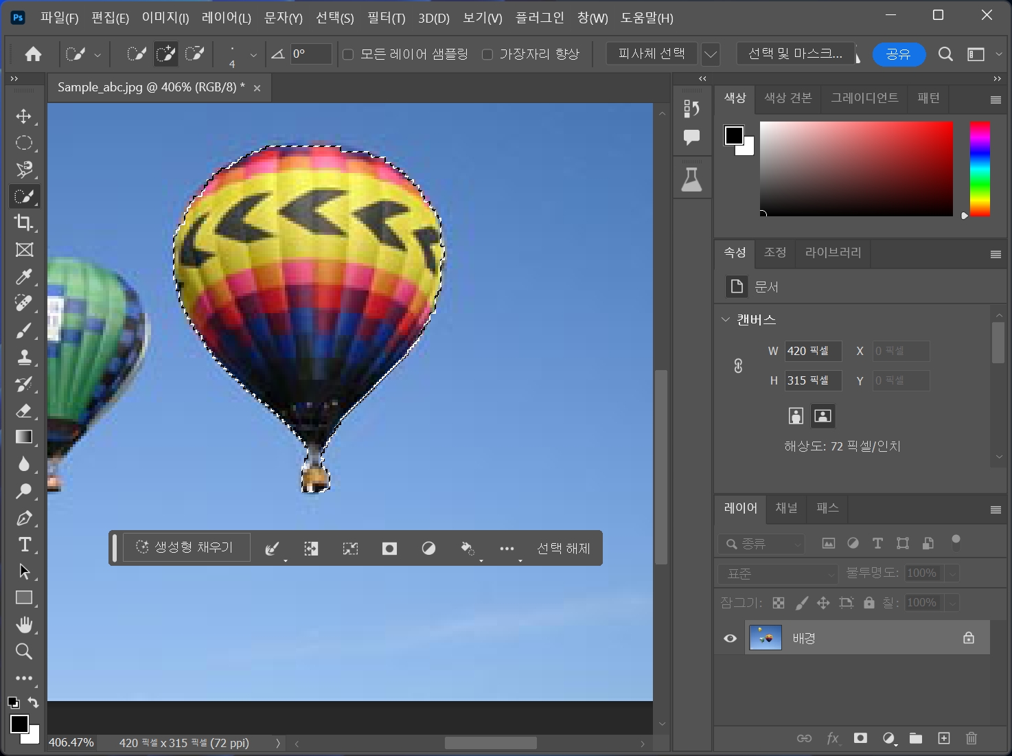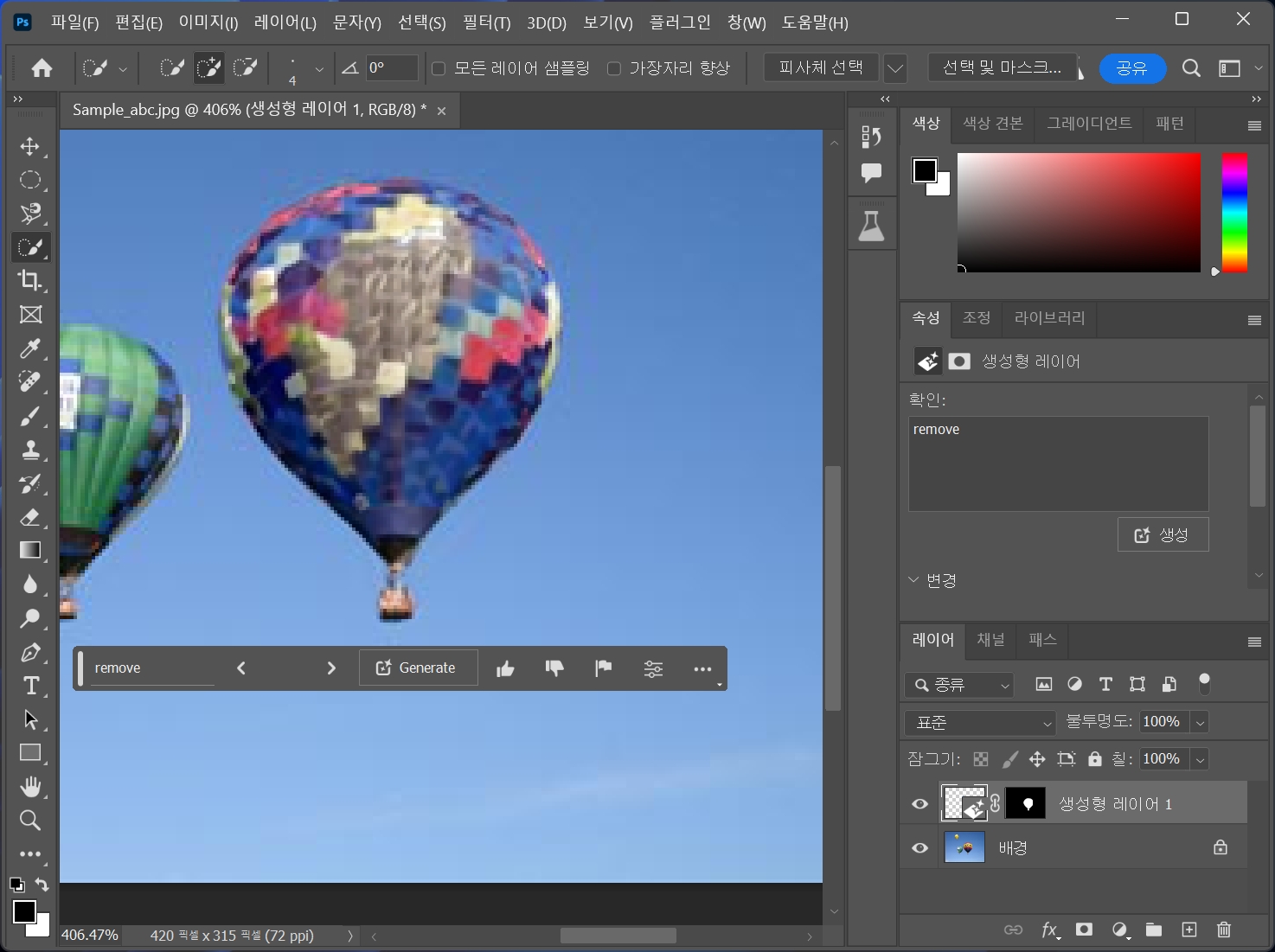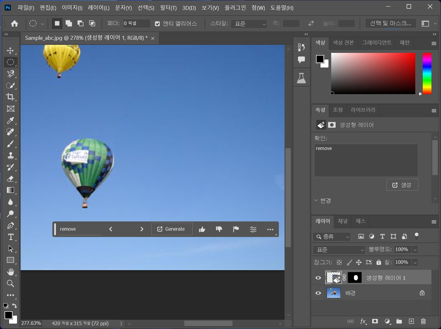 열기구를 선택하고 생성형 채우기를 클릭합니다.