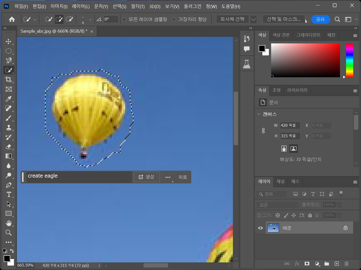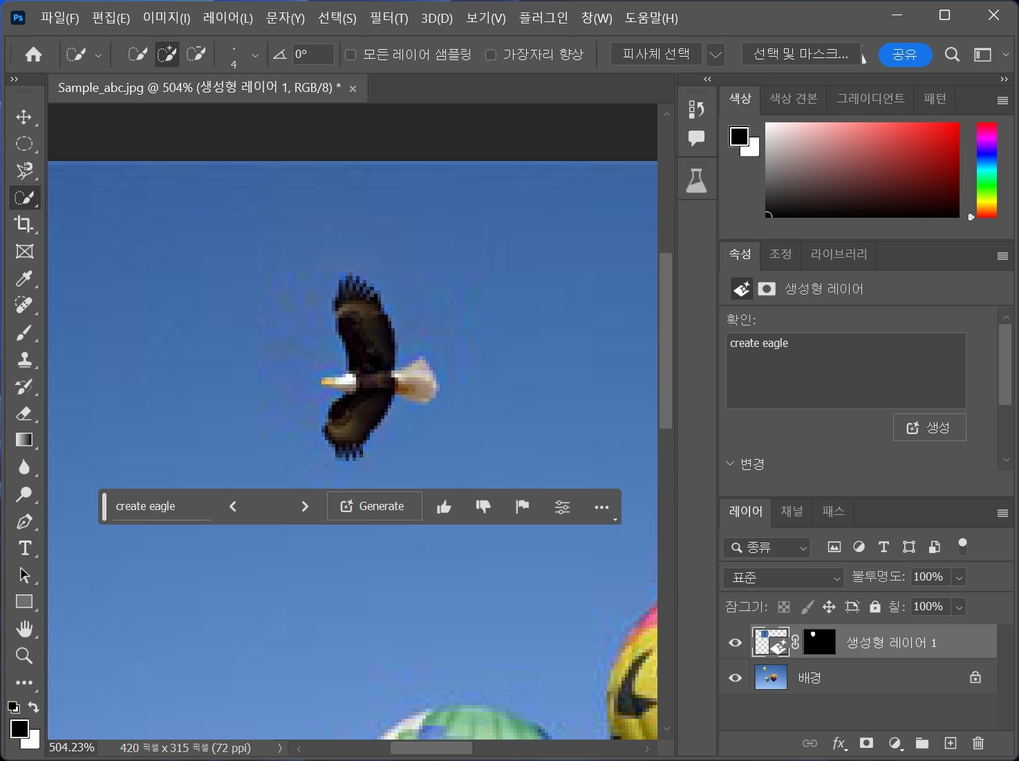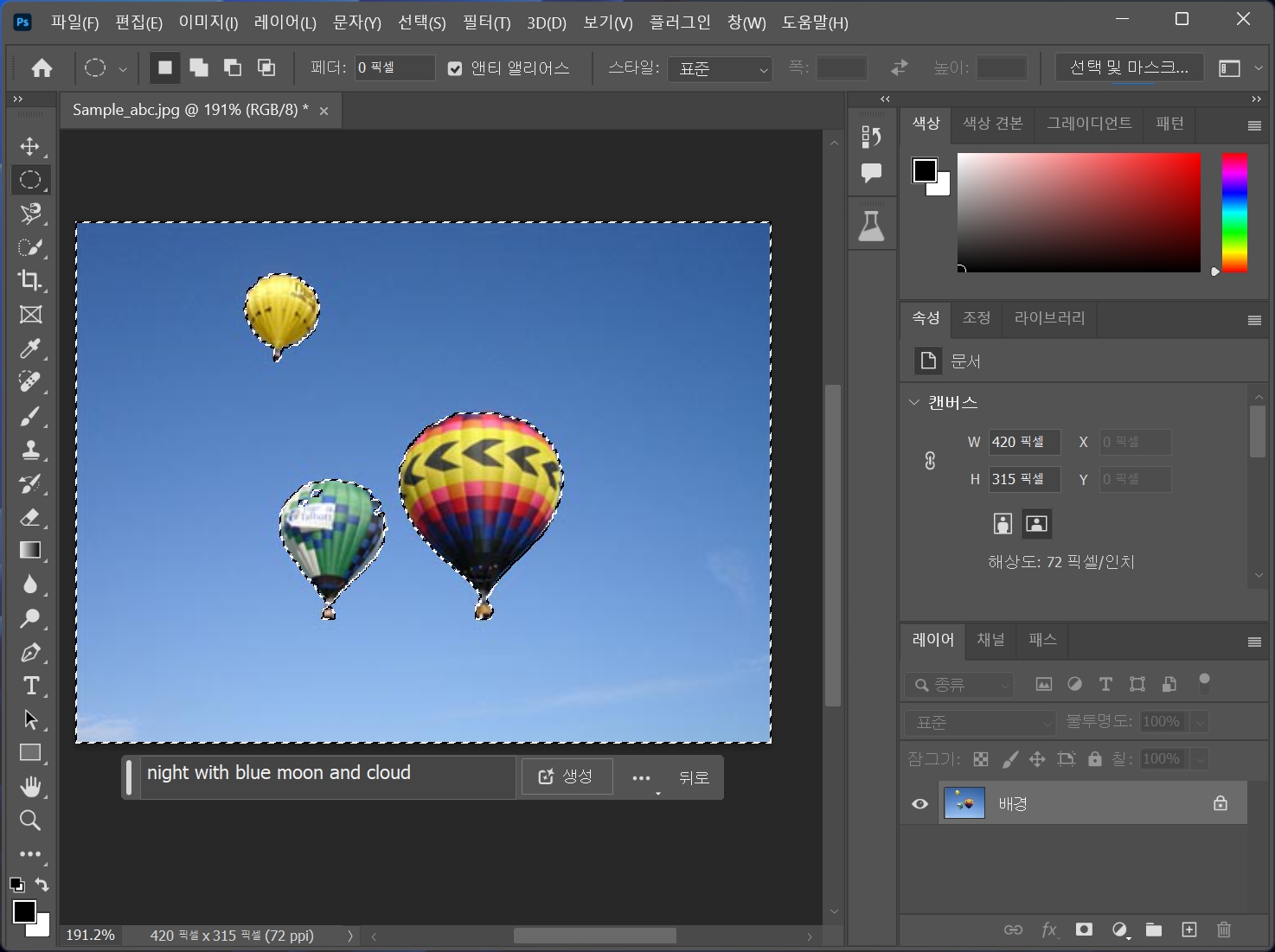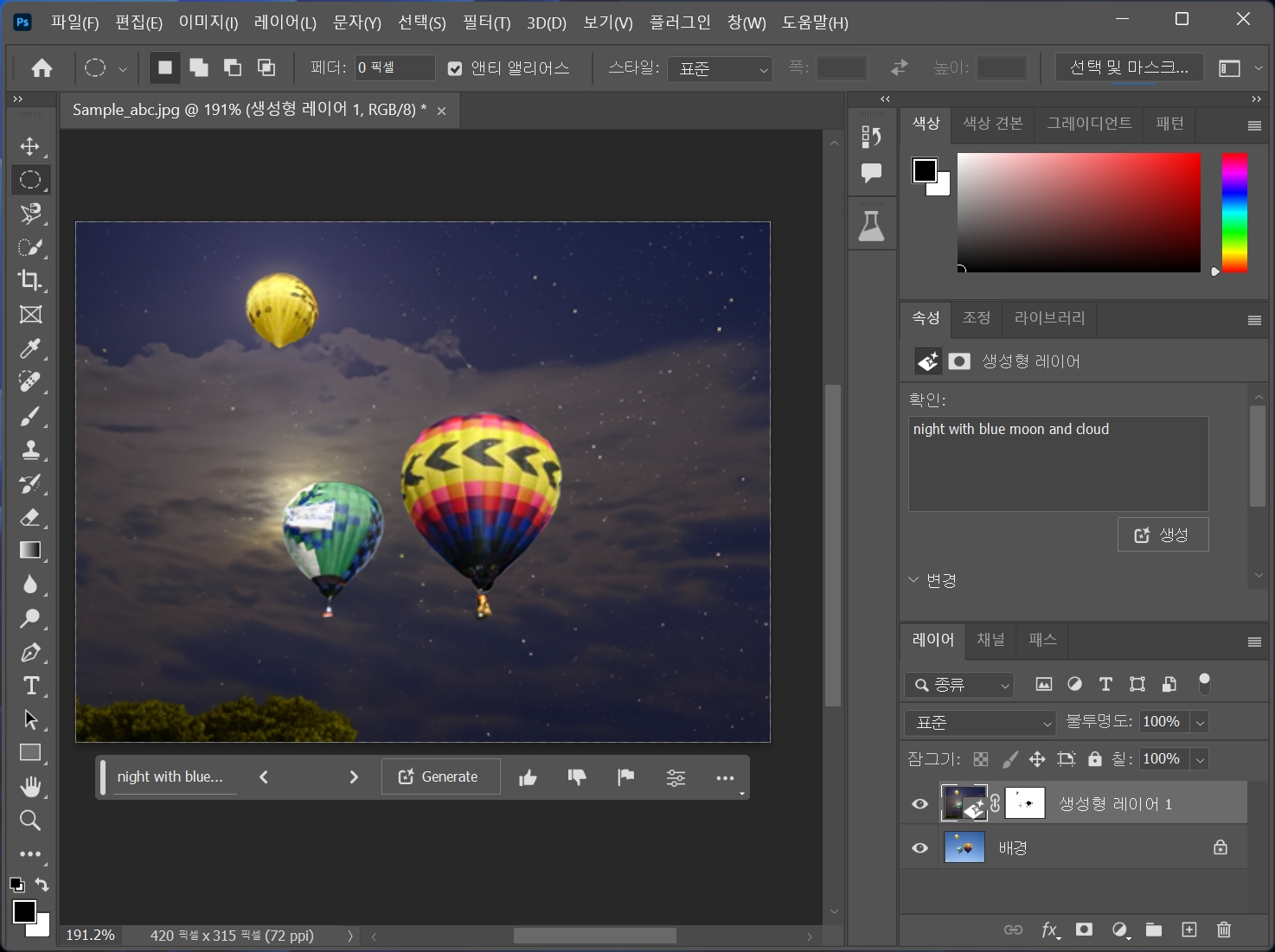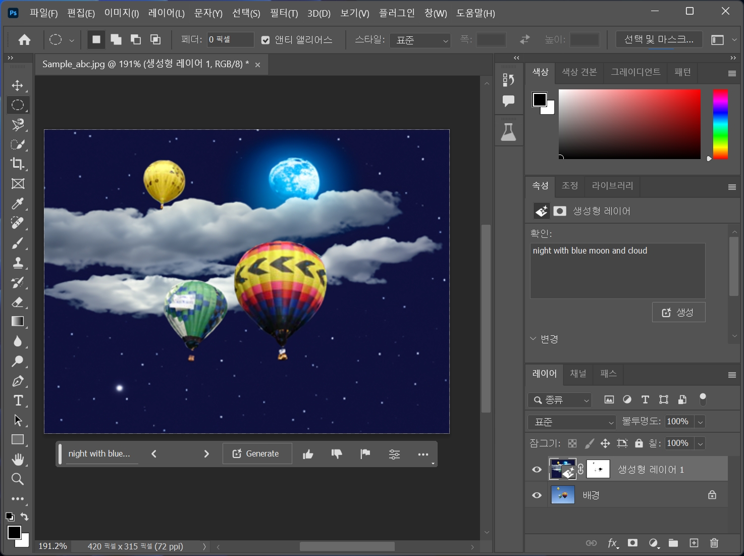 열기구를 선택하고 생성형 채우기를 클릭합니다.
