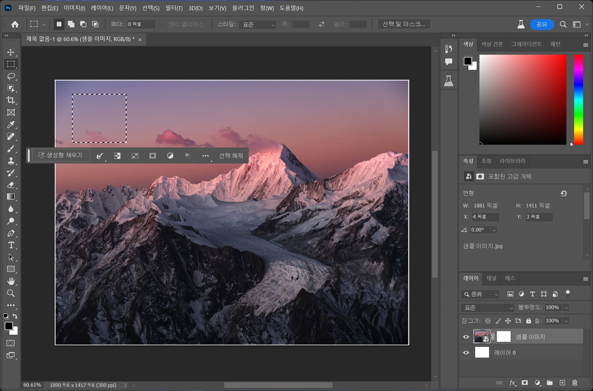 선택 메뉴를 통해서 이미지를 넣을 범위를 정합니다. 생성형 채우기를 클릭합니다.