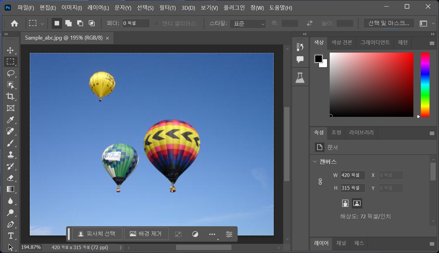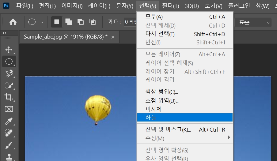 열기구가 깔끔하게 삭제되었습니다.사라진 자리에는 하늘 배경이 자연스럽게 덮였습니다.