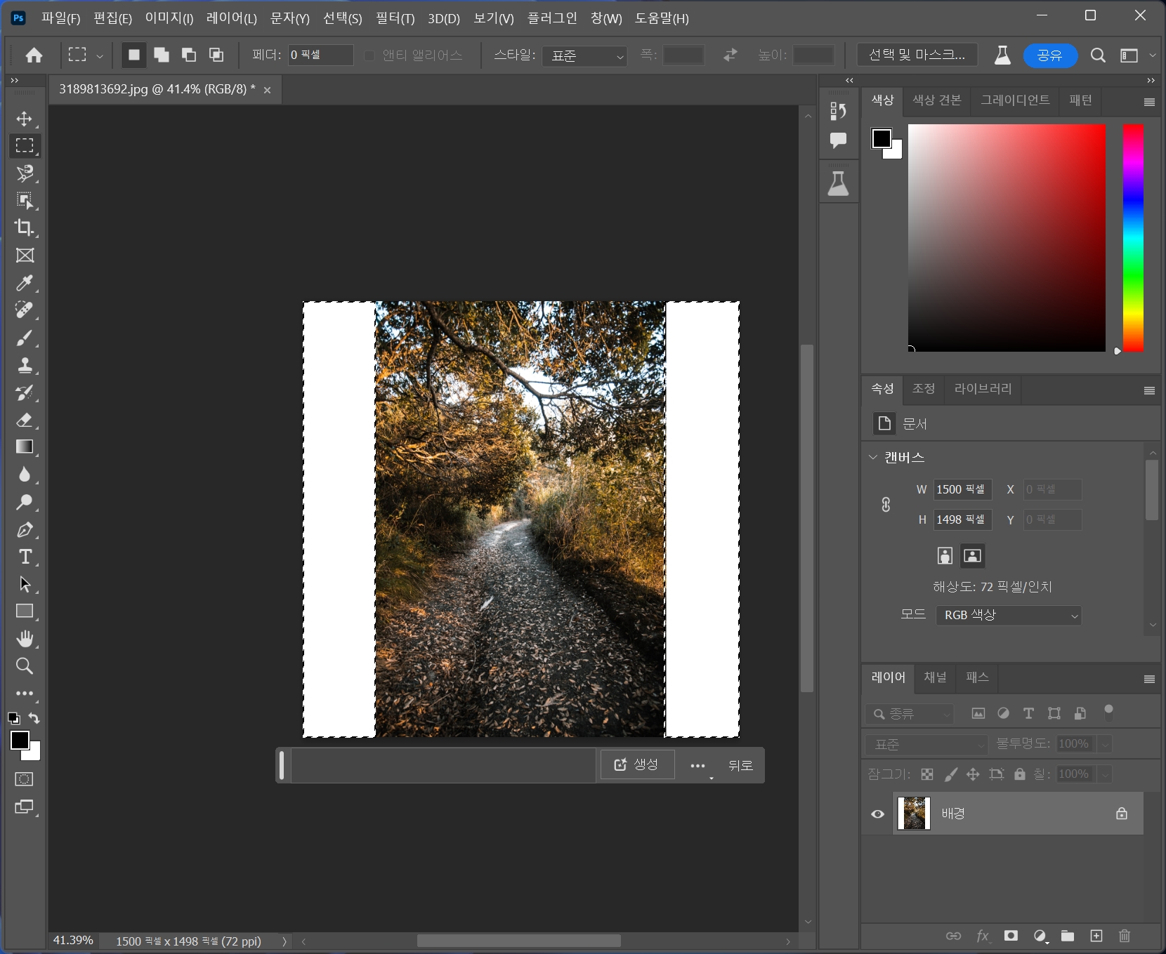 부족한 배경을 파이어플라이를 이용해서 확장할 수 있습니다. 위 이미지는 세로형이라, 좌우가 비어 있습니다. 선택 툴로 좌 우 빈 곳을 선택합니다. 생성형 채우기를 클릭하고 아무것도 입력하지 않은 채 생성 을 클릭합니다.