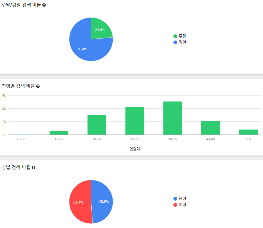 그밑에서도... 키워드의 통계자료가 나옵니다. 검색 동향, 월별 검색 비율, 주말/평일 검색 비율, 연령별/성별 검색비율 등 블로거가 생각할 수 있는 거의 모든 자료들이 나옵니다.