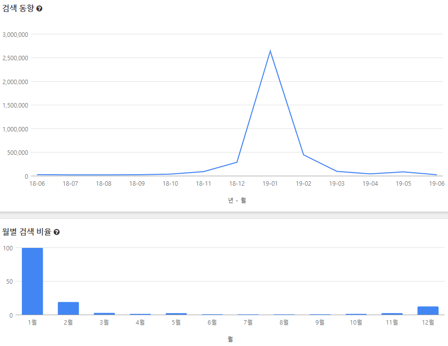 해당 키워드는 누가 가장 관심 있는지도 나오고, 검색 사이트의 섹션 배치 순서도 나옵니다.