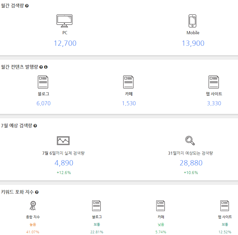 그 밑에는 월간 검색량, 월간 콘텐츠 발행량, 월 예상 검색량, 키워드 포화지수가 나옵니다. 딱 봐도 뭐가 어떤 건지 직관적으로 알 수 있어 보기 편했습니다. 제 생각으로는 이 데이터를 토대로 키워드의 등급을 자체적으로 매기는 것 같습니다.