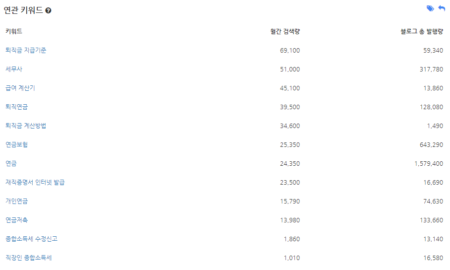 밑에는 연관검색어와 그 연관검색어의 월간 검색량, 그리고 블로그 총 발행량이 나옵니다. 전 이 기능을 좋아합니다. 이걸 통해서 롱테일 키워드를 찾아서 글에 반영할 수 있기 때문입니다. 다른 사이트들은 하나하나 검색을 해야 했는데, 블랙키위는 이렇게 한 번에 볼 수 있어서 편했습니다.