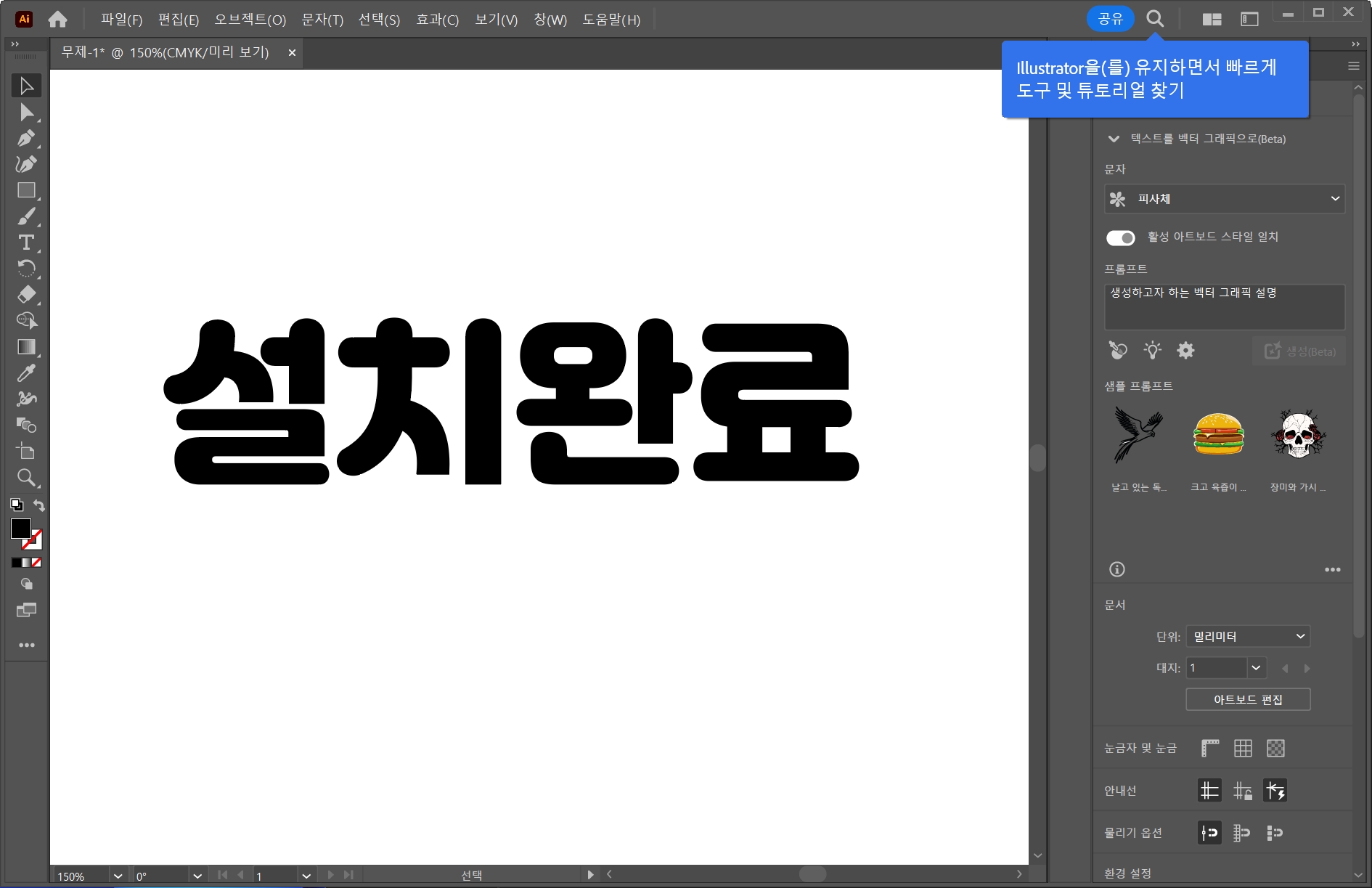 일러스트 2024 설치가 완료되었습니다. 텍스트로 이미지 생성하는 기능이 우측에 있는 걸 확인할 수 있습니다.