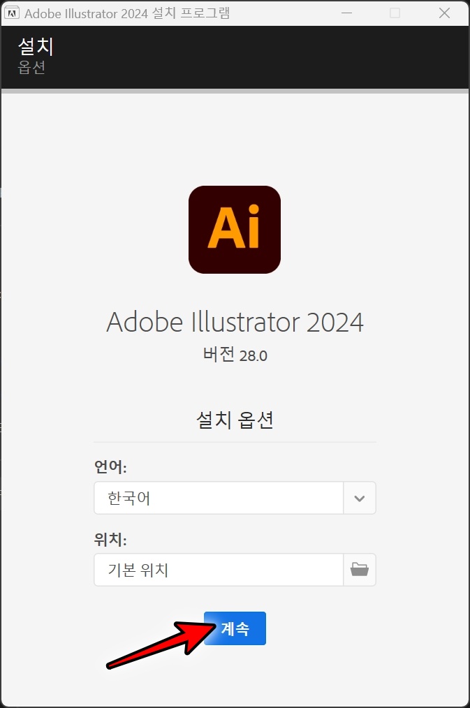 설치할 언어와 설치 위치를 설정한 후 계속 을 클릭합니다. 일러스트 2024 설치가 시작됩니다.