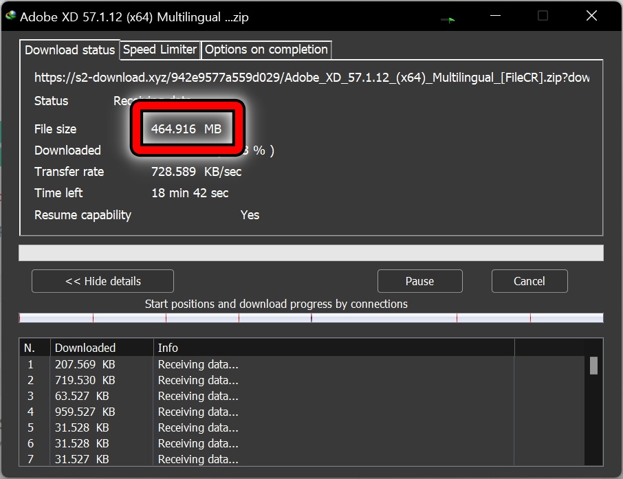 파일을 다운로드 중입니다. 어도비 XD 2024 파일 크기는 464Mb입니다.