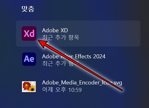 윈도우 시작 버튼을 누르면 Adobe XD가 있을 겁니다. 클릭해서 앱을 실행합니다.