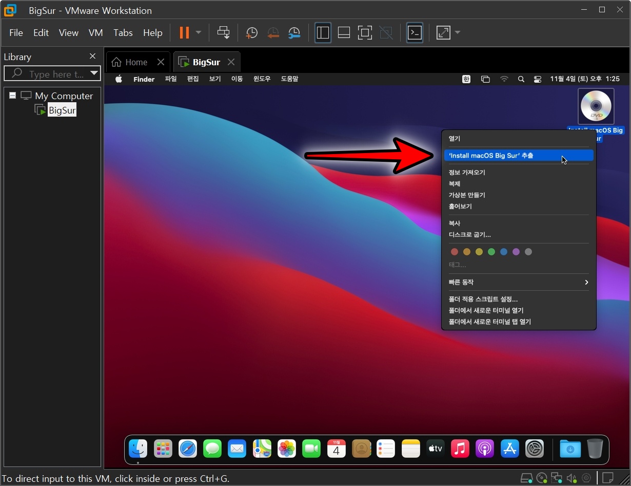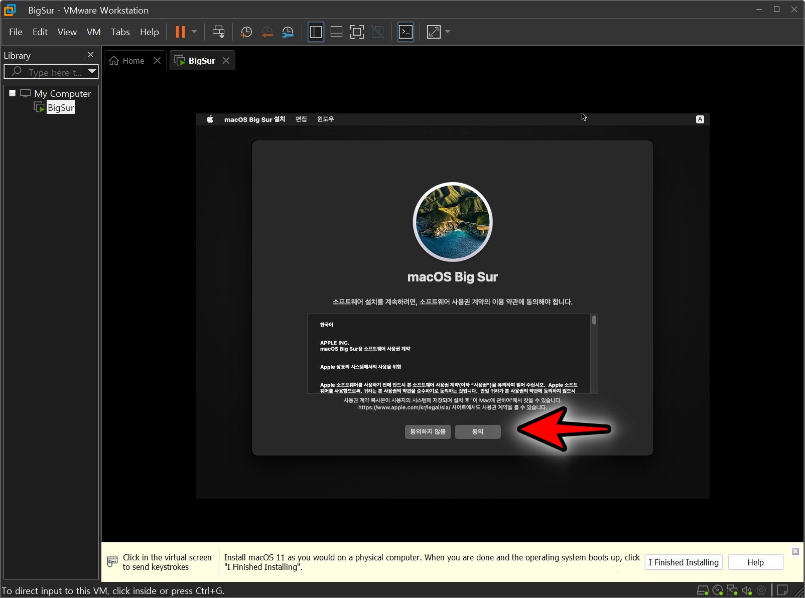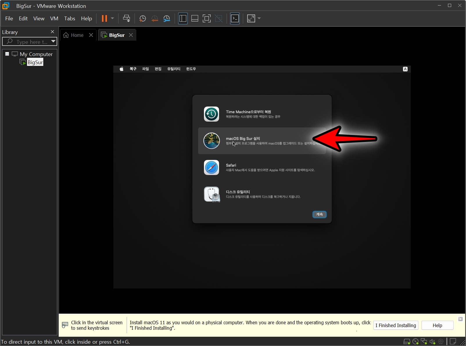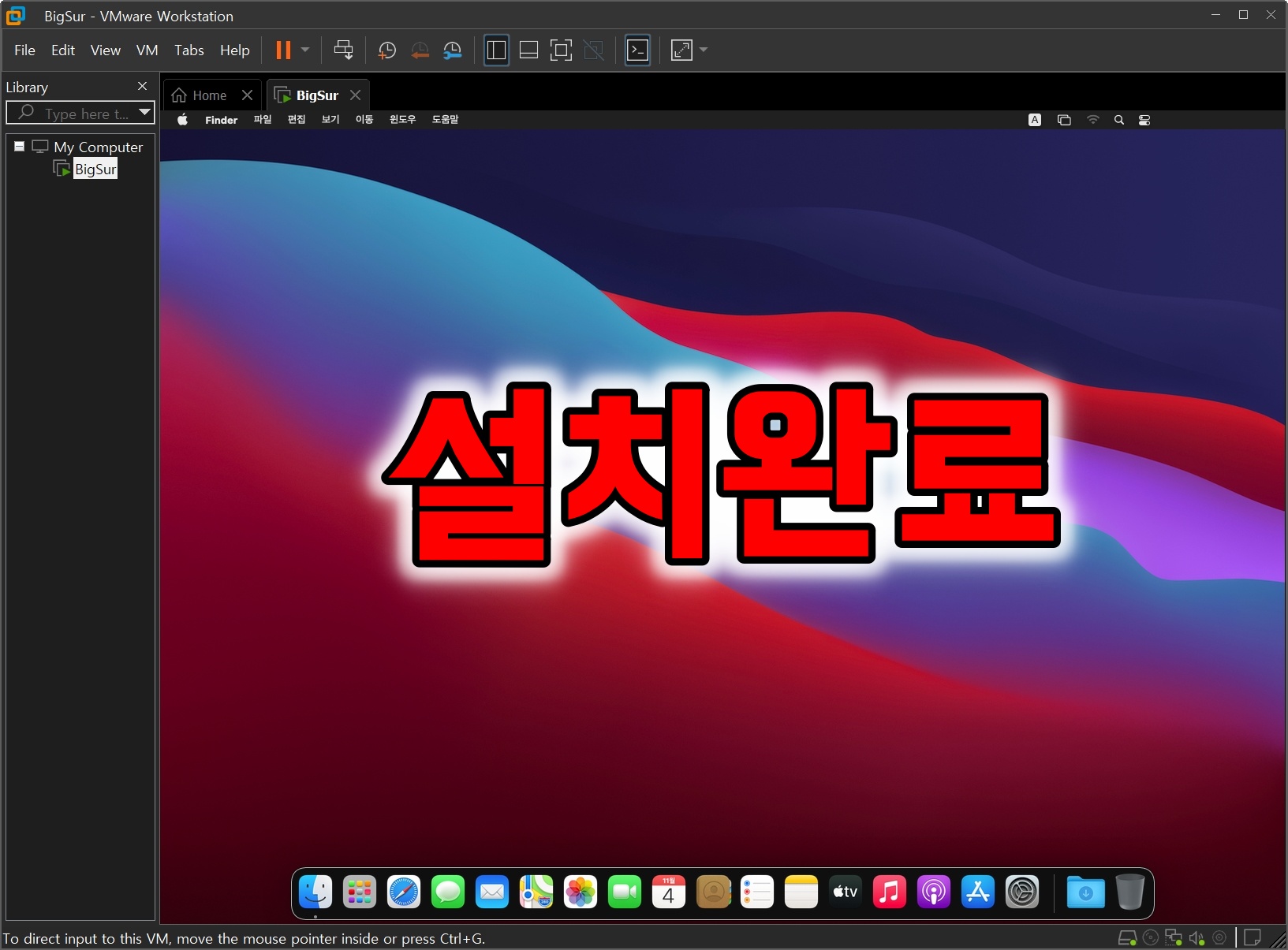 윈도우 11 환경에서 맥OS Big Sur 설치가 완료되었습니다.