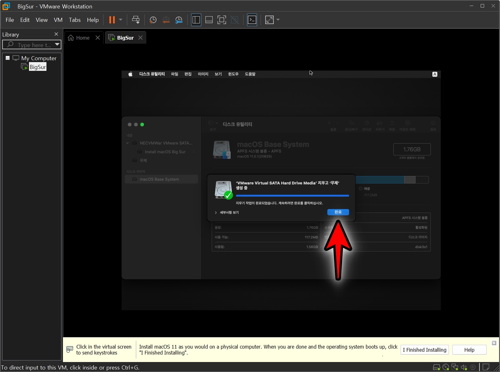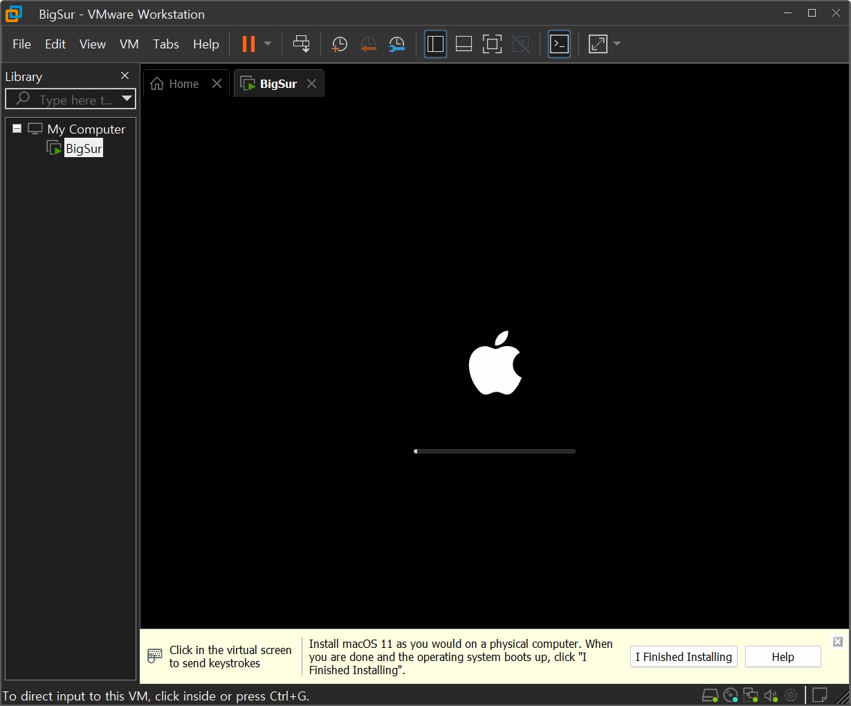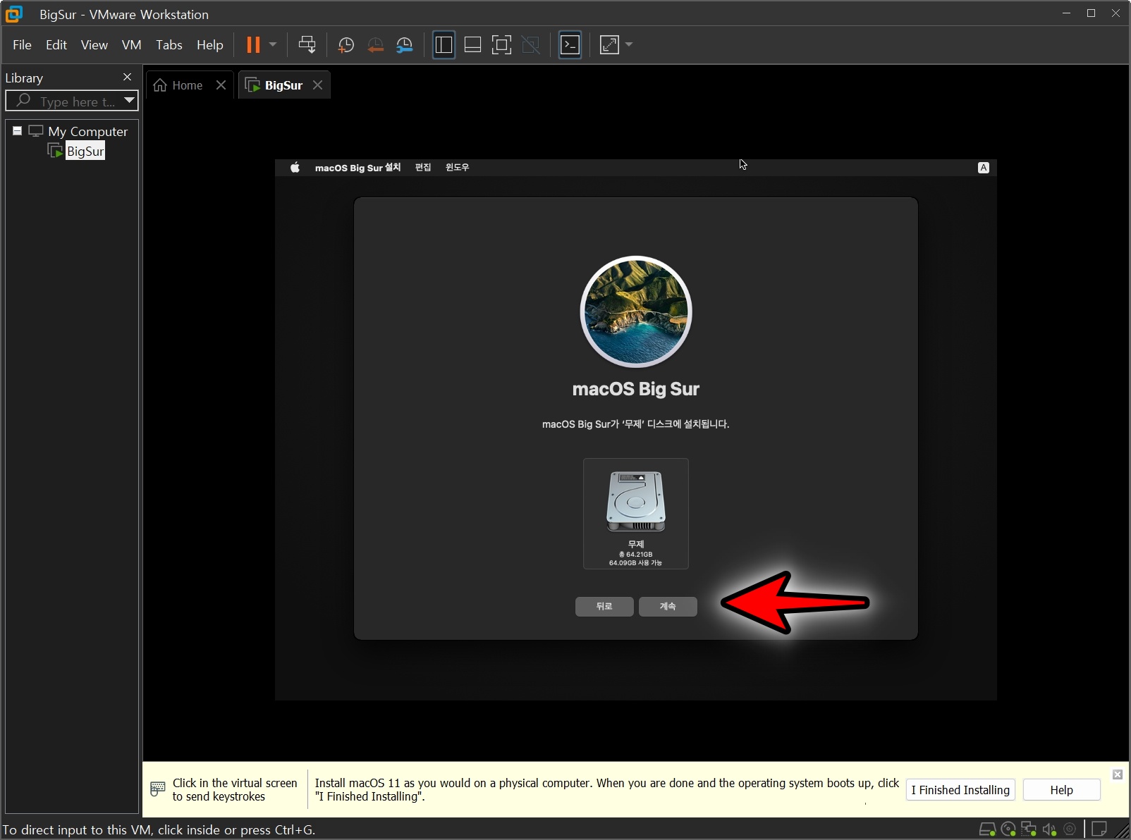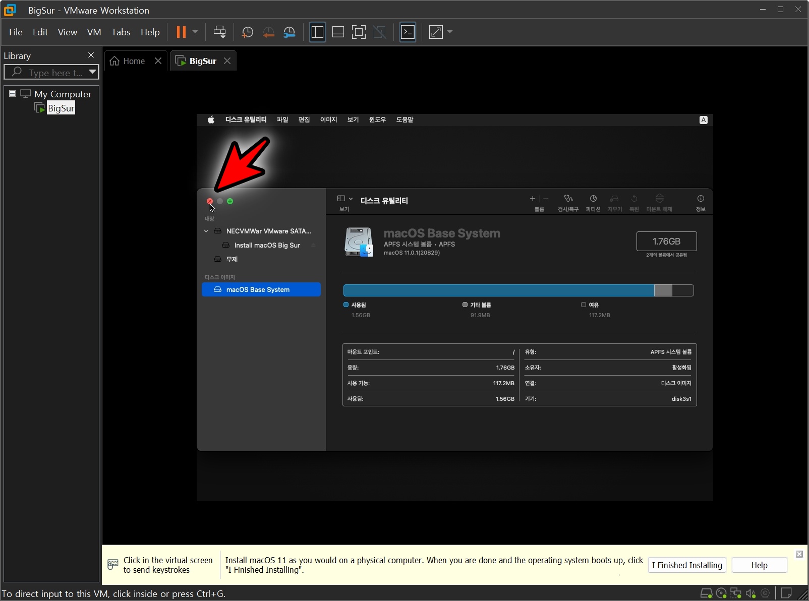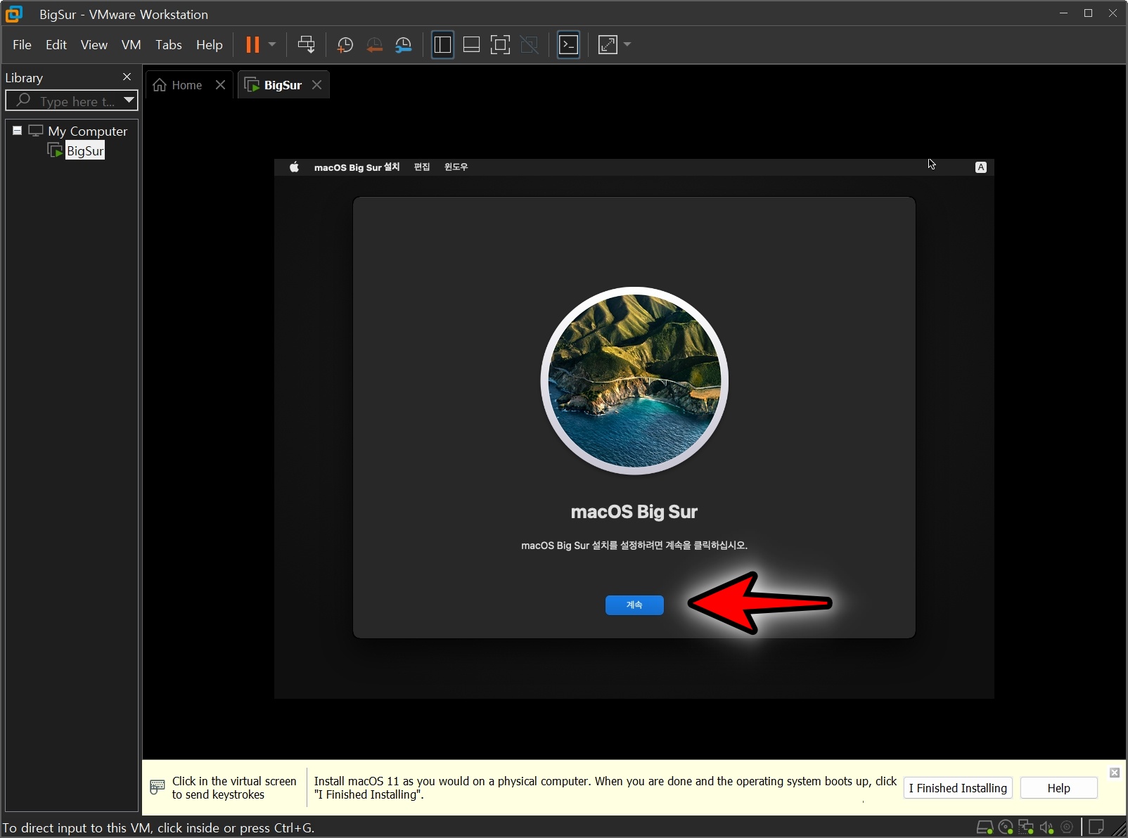 윈도우 11 환경에서 맥OS Big Sur 설치가 완료되었습니다.