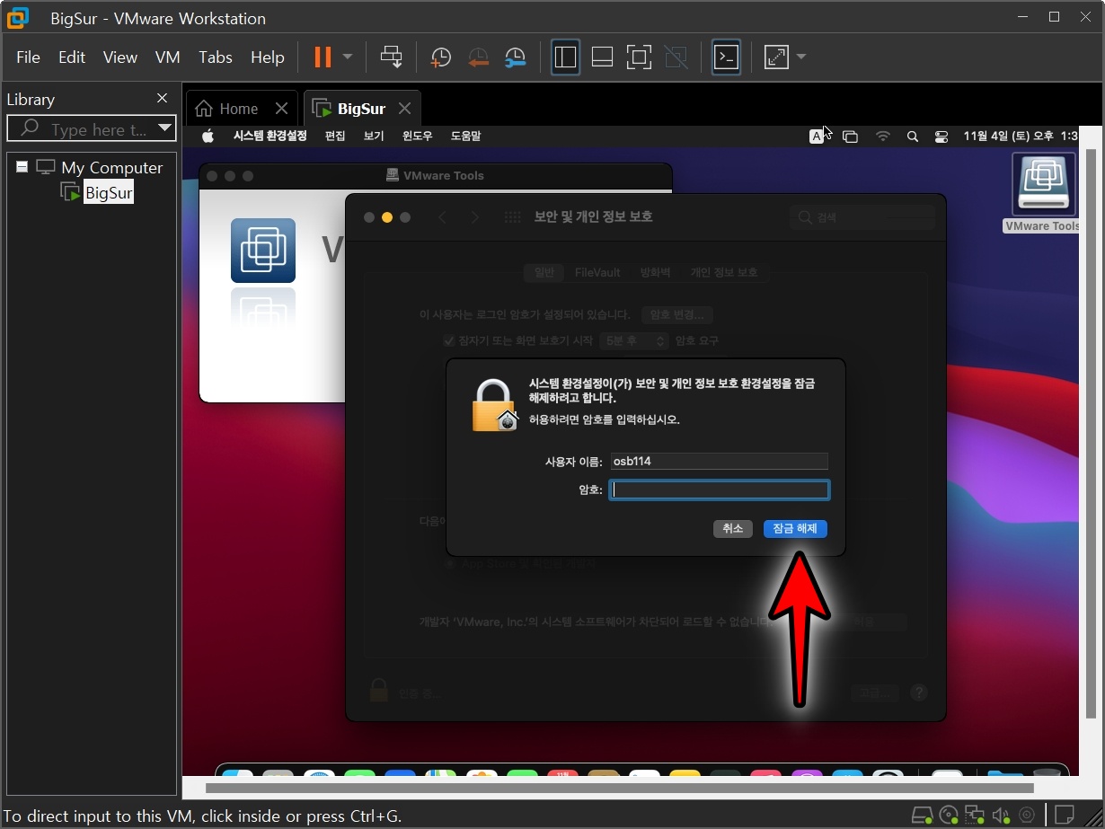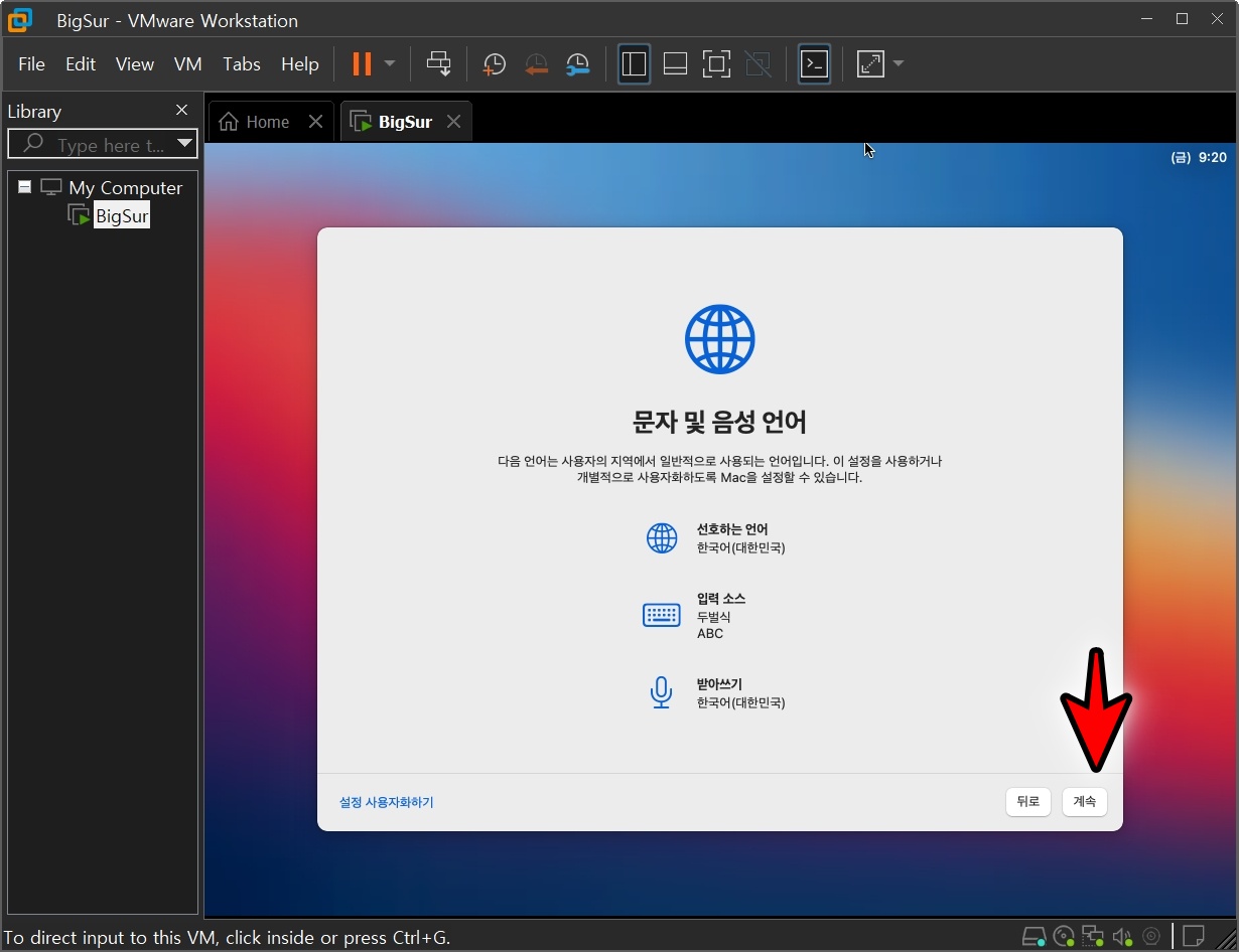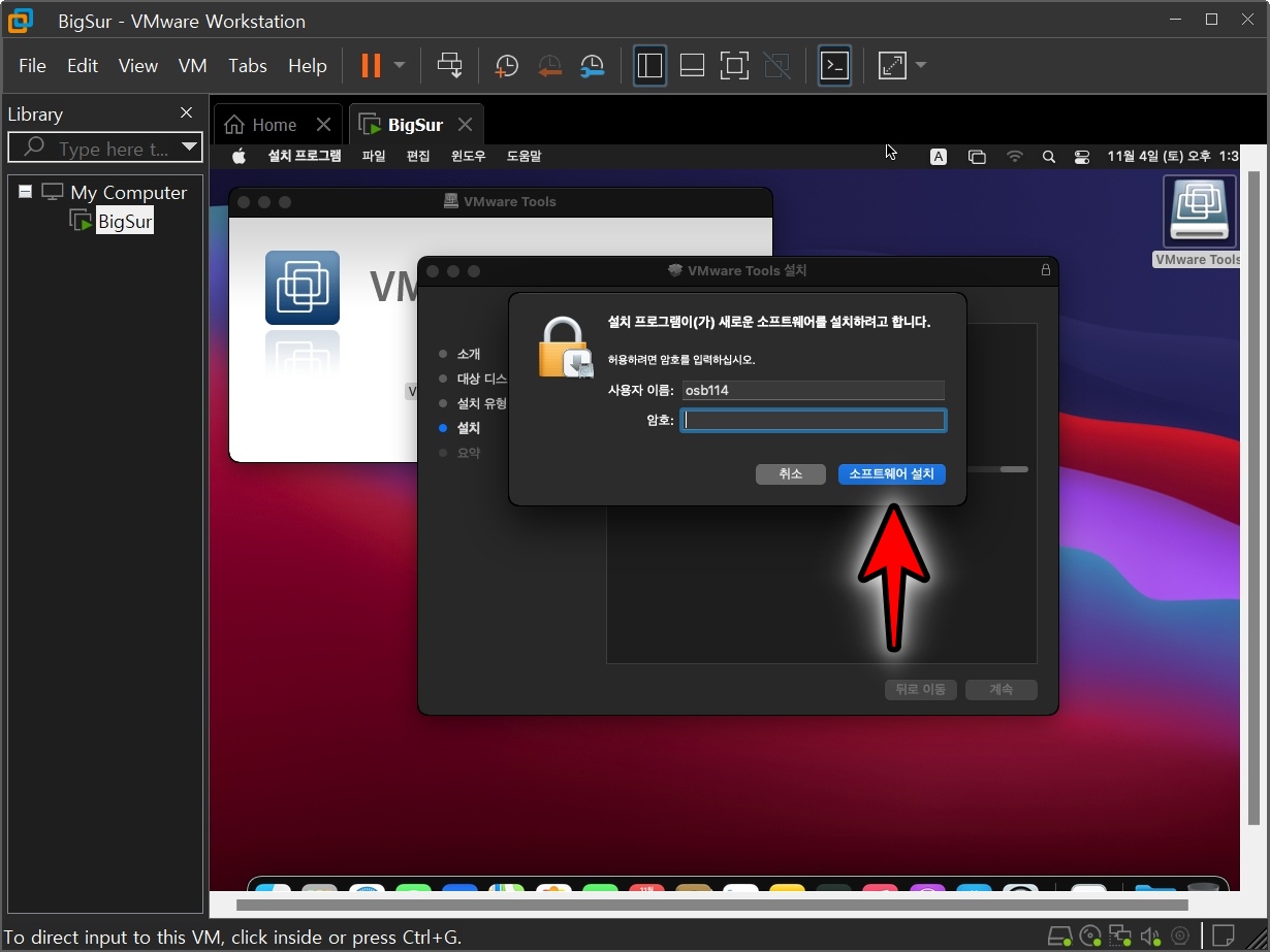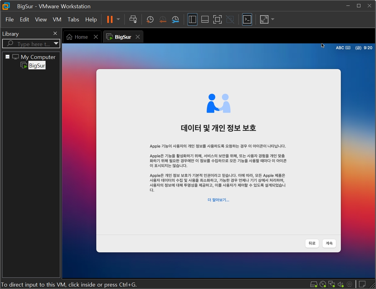 윈도우 11 환경에서 맥OS Big Sur 설치가 완료되었습니다.