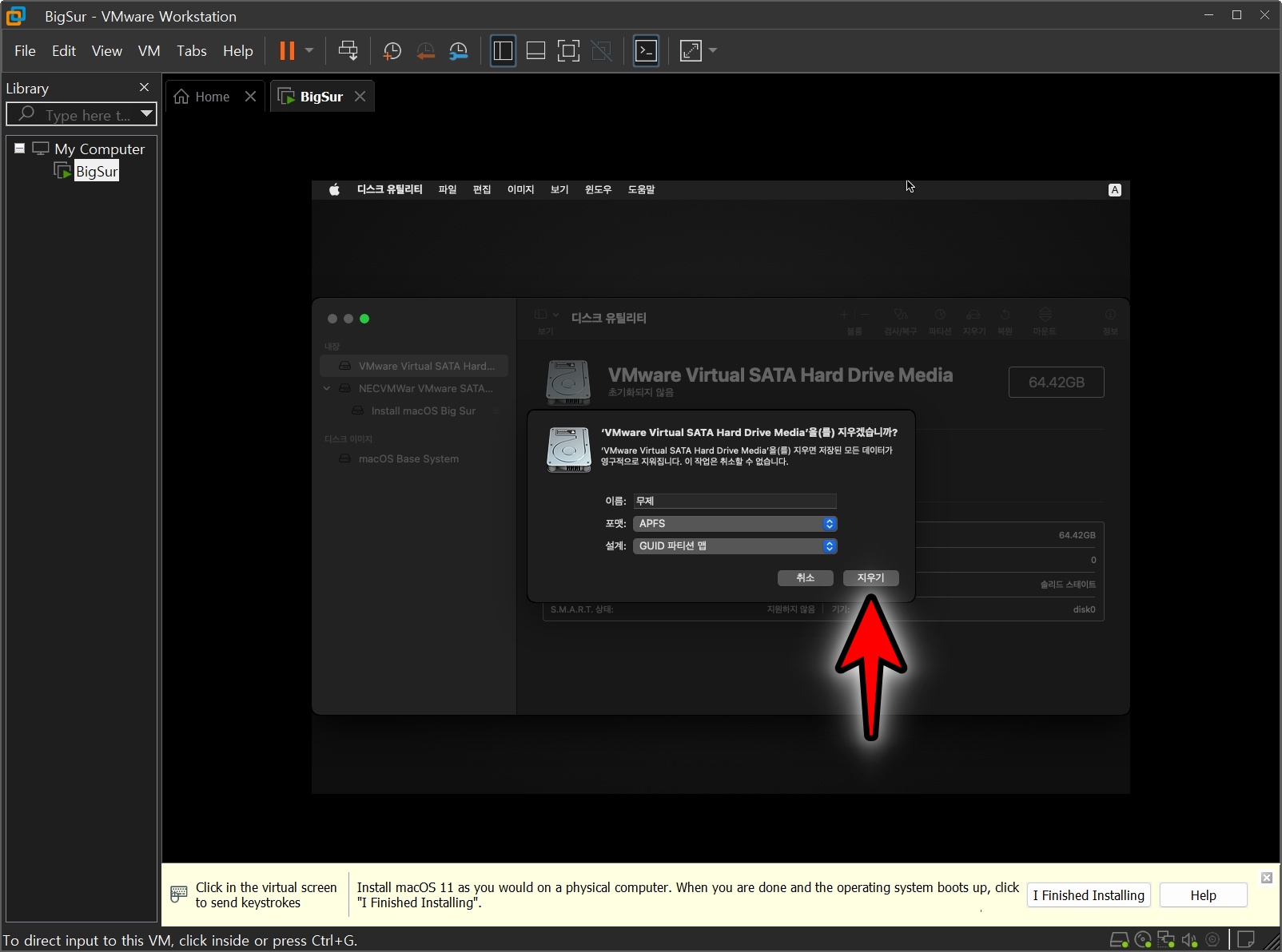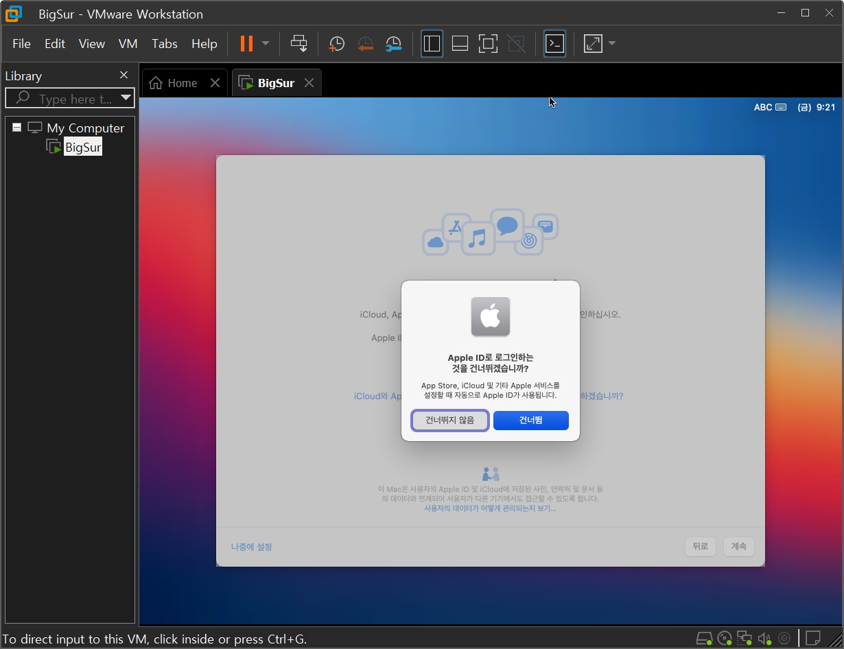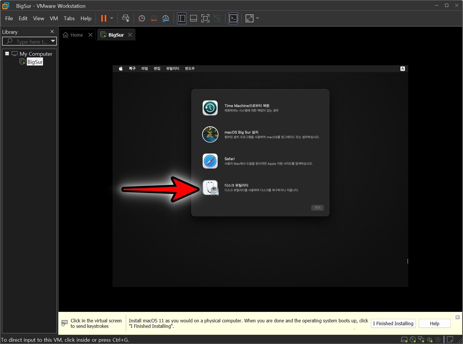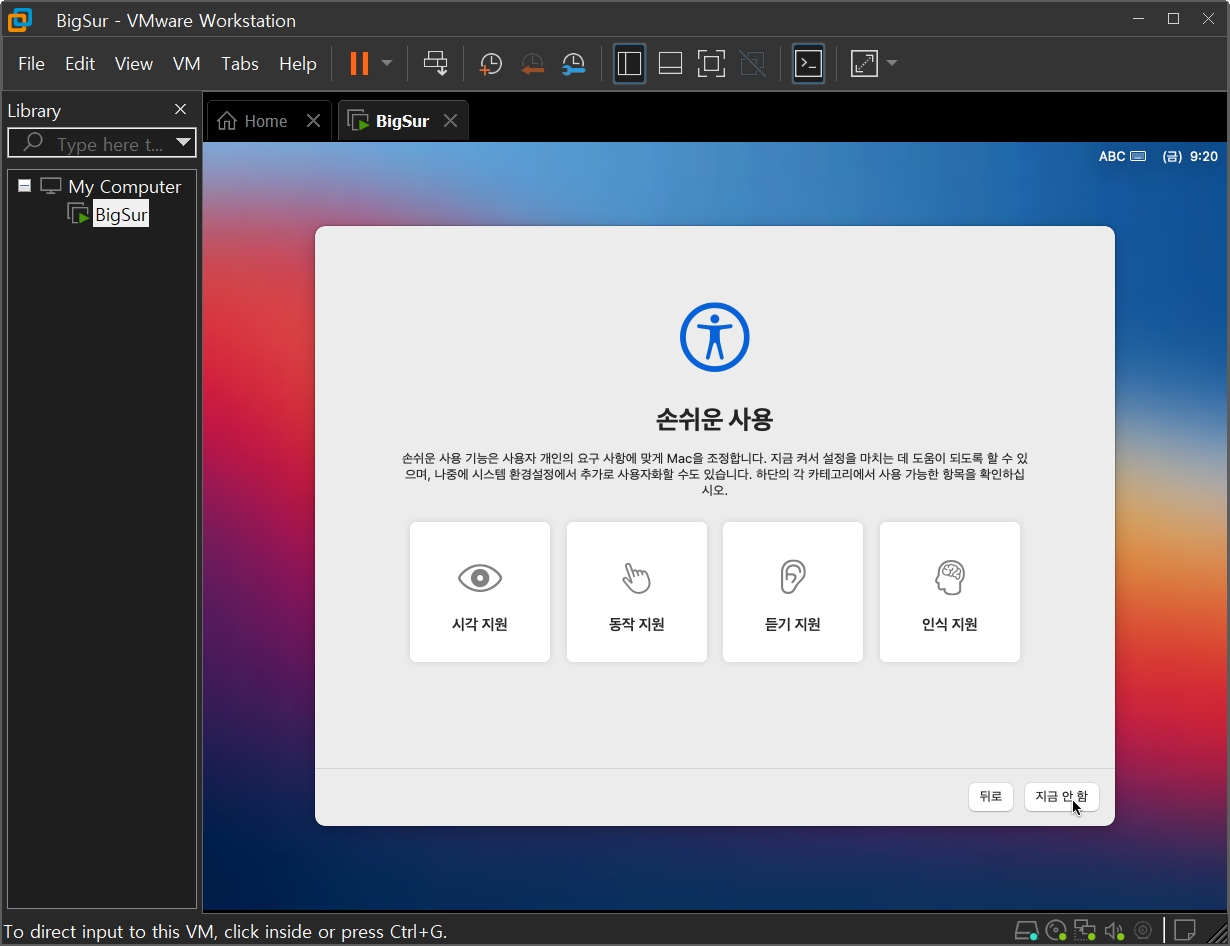윈도우 11 환경에서 맥OS Big Sur 설치가 완료되었습니다.