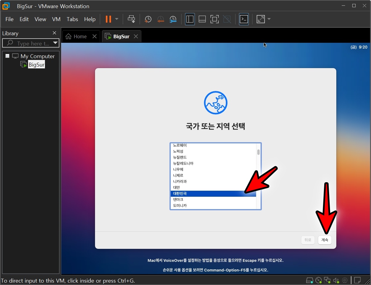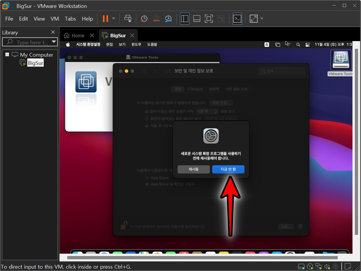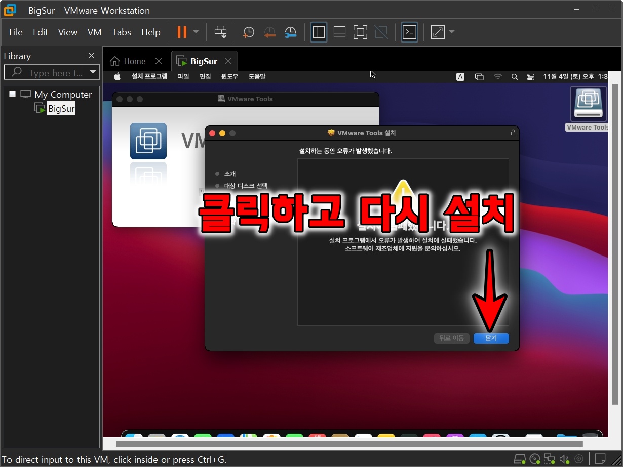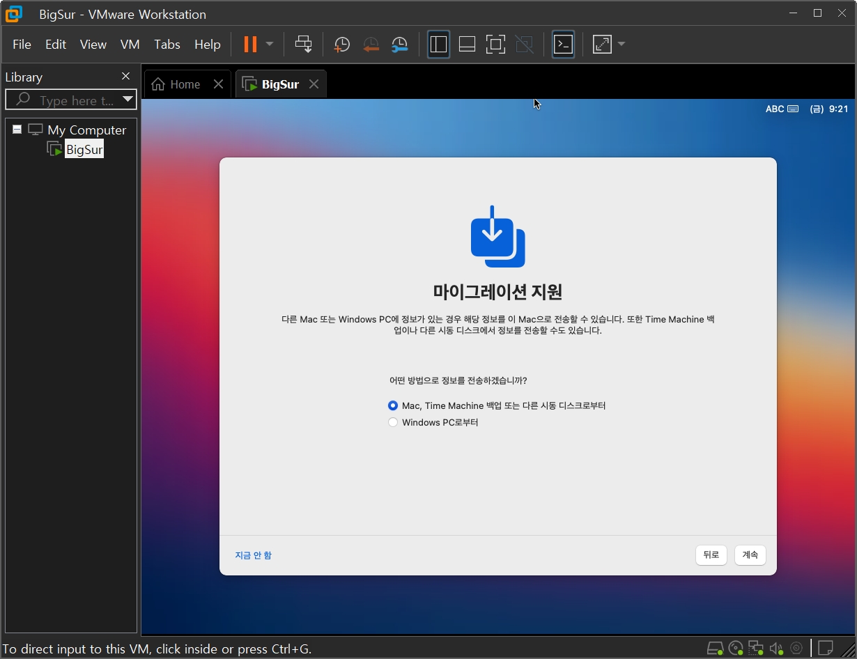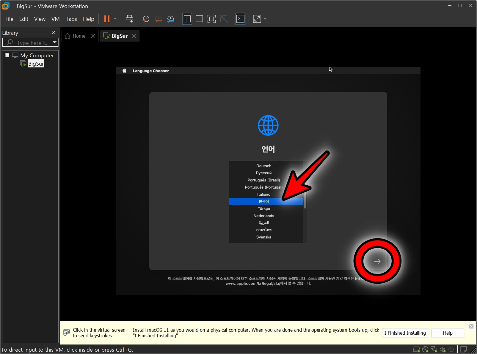 윈도우 11 환경에서 맥OS Big Sur 설치가 완료되었습니다.
