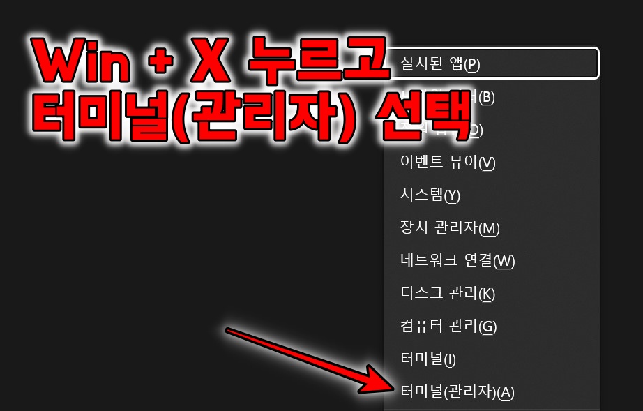 win+x키를 누르고 터미널(관리자)를 실행합니다.