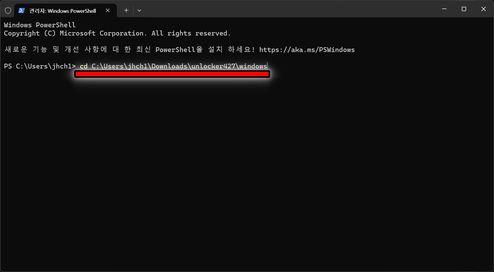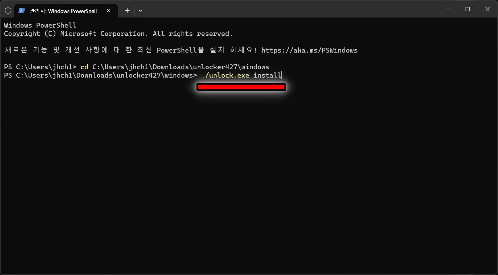 ./unlock.exe install을 입력하고 엔터를 칩니다.