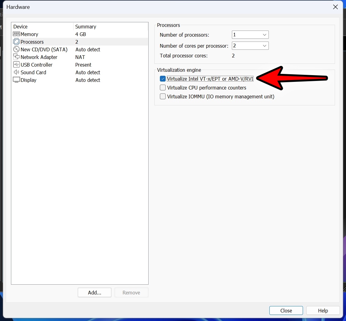 프로세서는 2개로 설정하고 Virtualize Intel VT-x/EPT or AMD-V/RVI에 체크합니다.