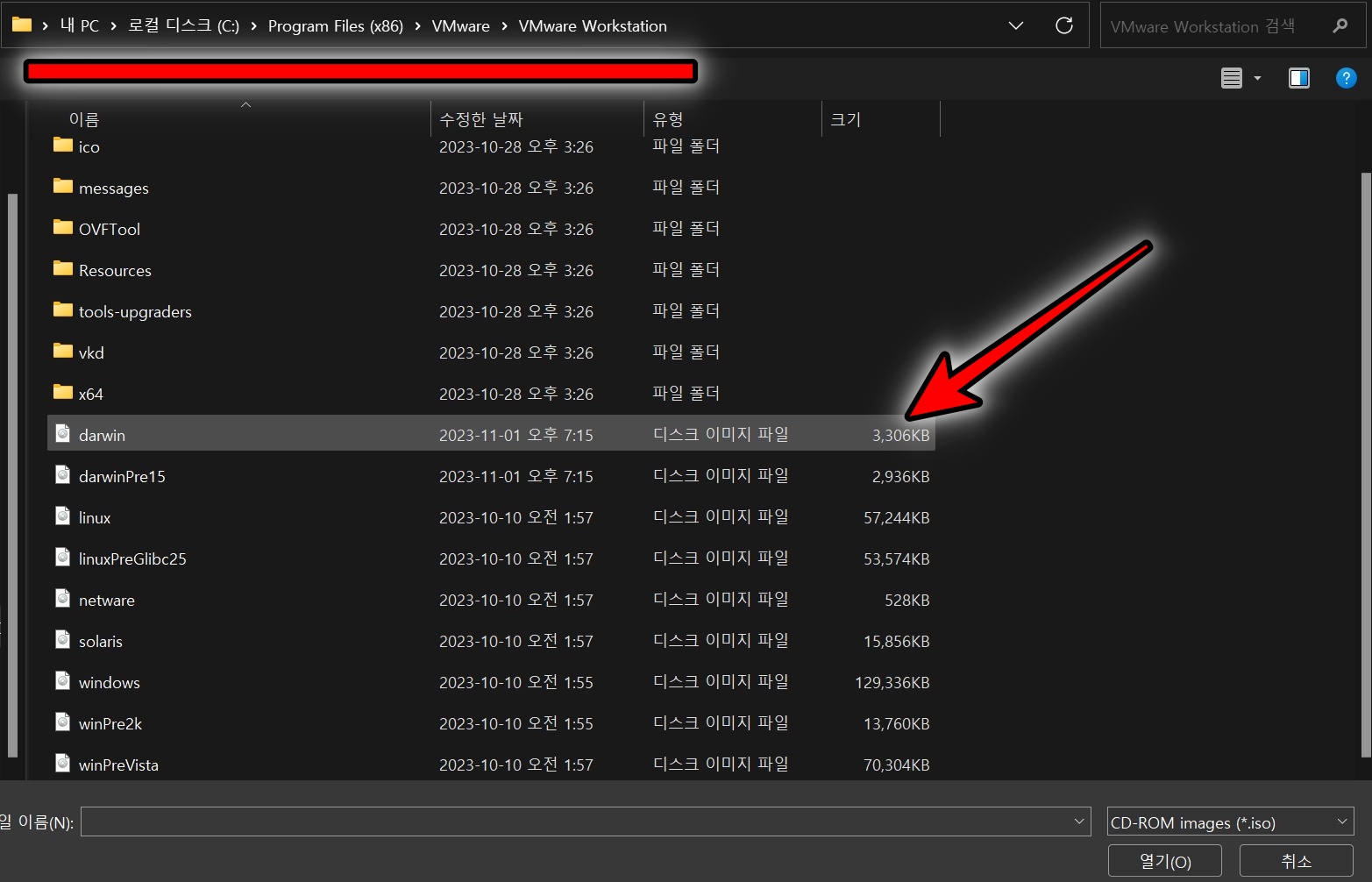 C:/Program Files (x86)/VMware/VMware Workstarion 폴더 내에 있는 darwin 파일을 선택합니다.