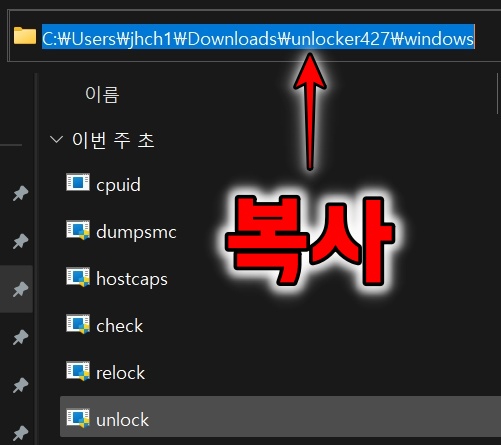 압축을 푼 폴더의 경로를 복사합니다. unlock 파일이 있는 경로를 복사하시면 됩니다.