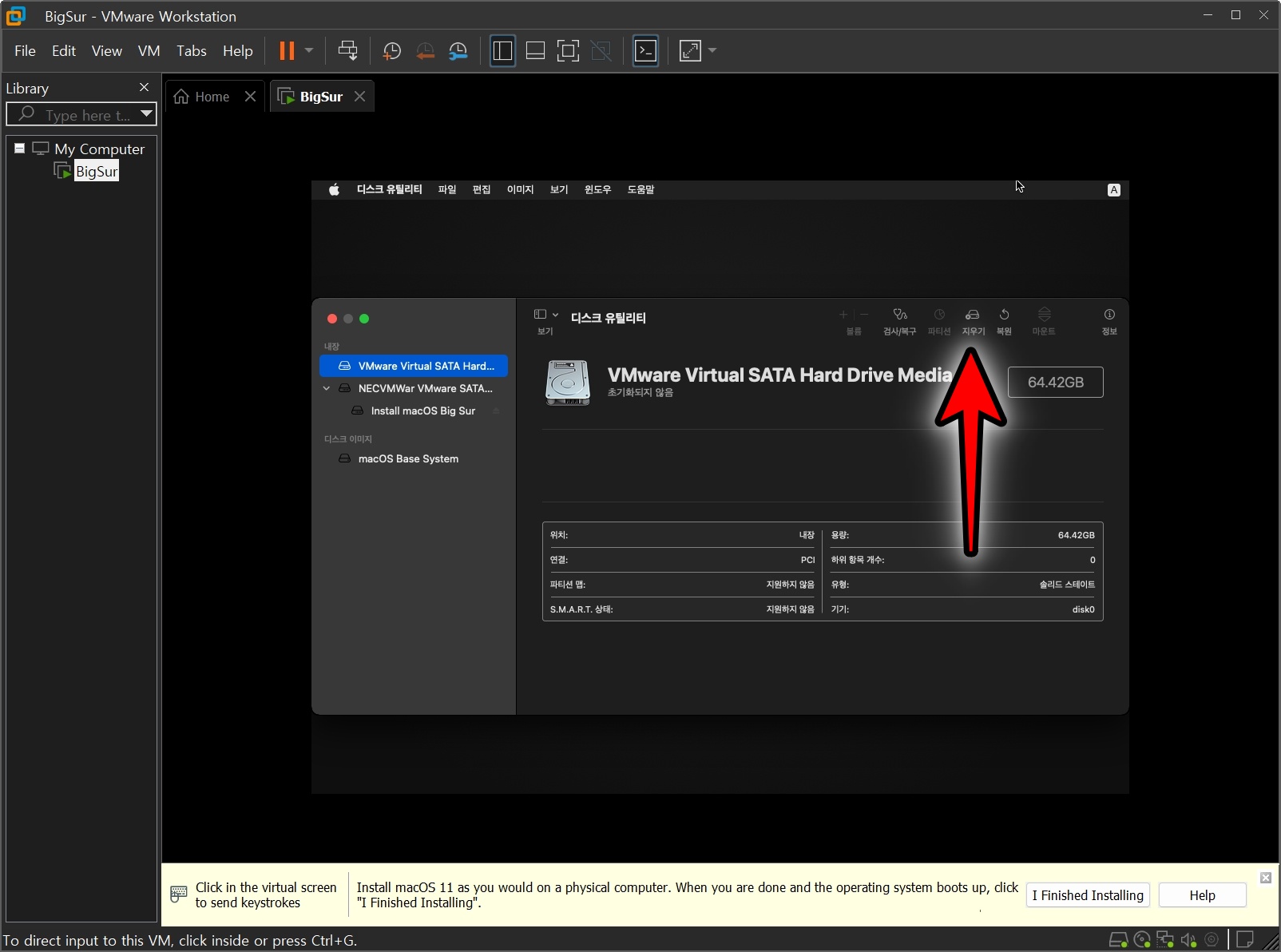 디스크 유틸리티를 선택합니다. VMware Virtual SATA..를 선택하고 지우기 를 선택합니다.