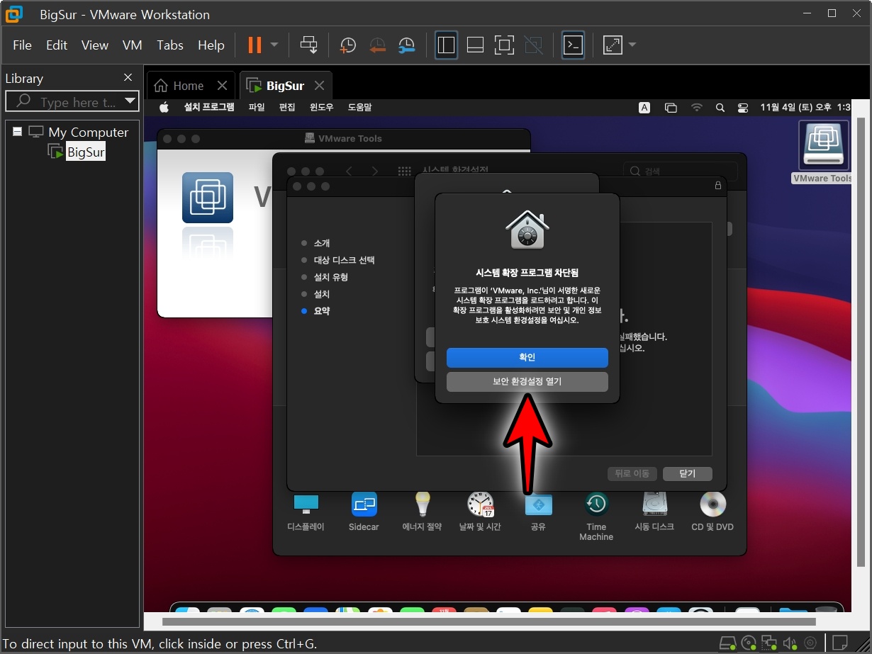 소프트웨어 설치 를 클릭하면 설치가 안되면서 시스템 확장 프로그램이 차단됨 창이 뜹니다. 보안 환경설정 열기 를 클릭합니다.