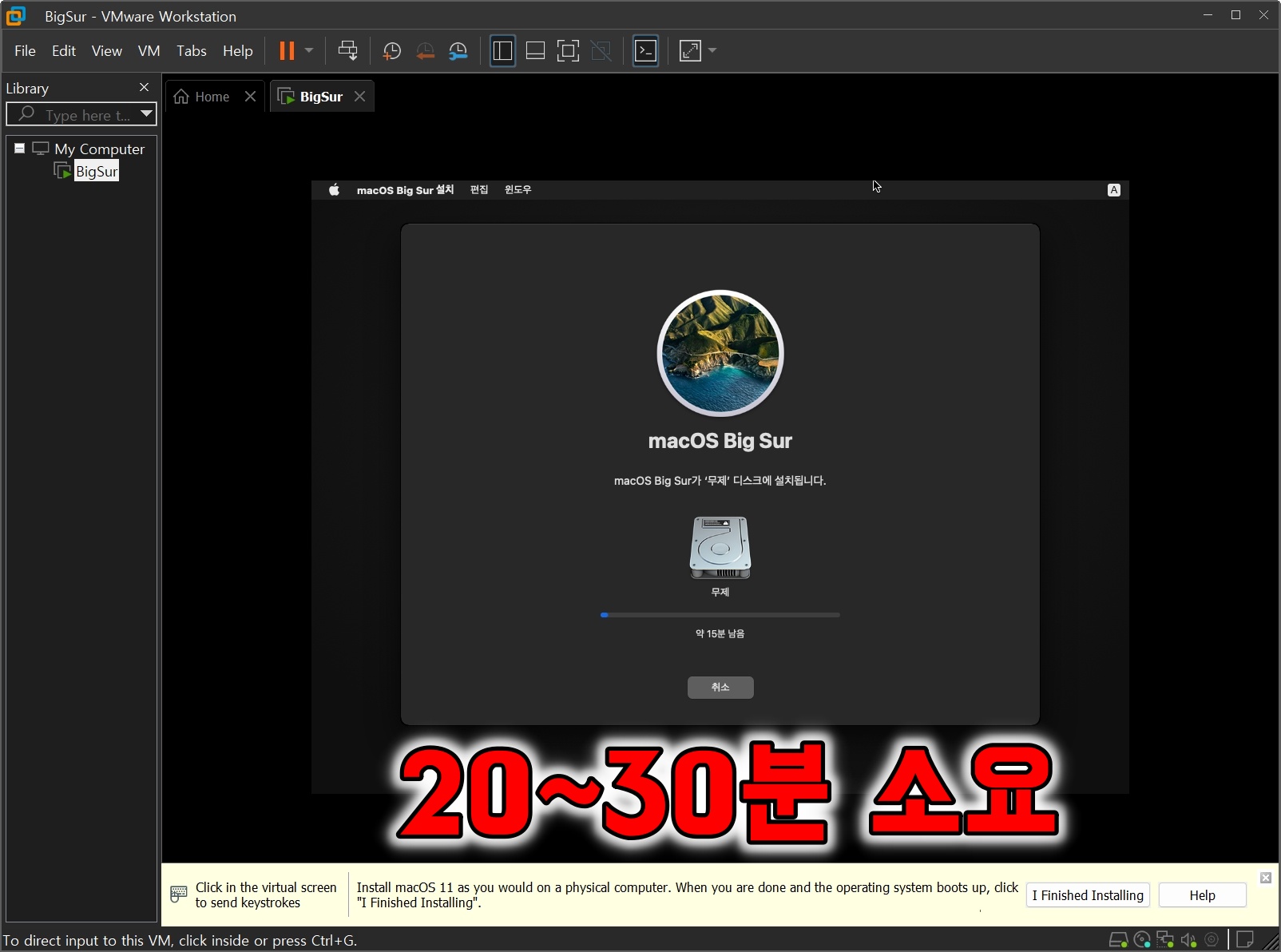 설정이 끝나면 macOS Big Sur 설치를 시작합니다. 설치는 20~30분이 소요됩니다. 컴퓨터 사양에 따라서 시간은 바뀔 수 있습니다.