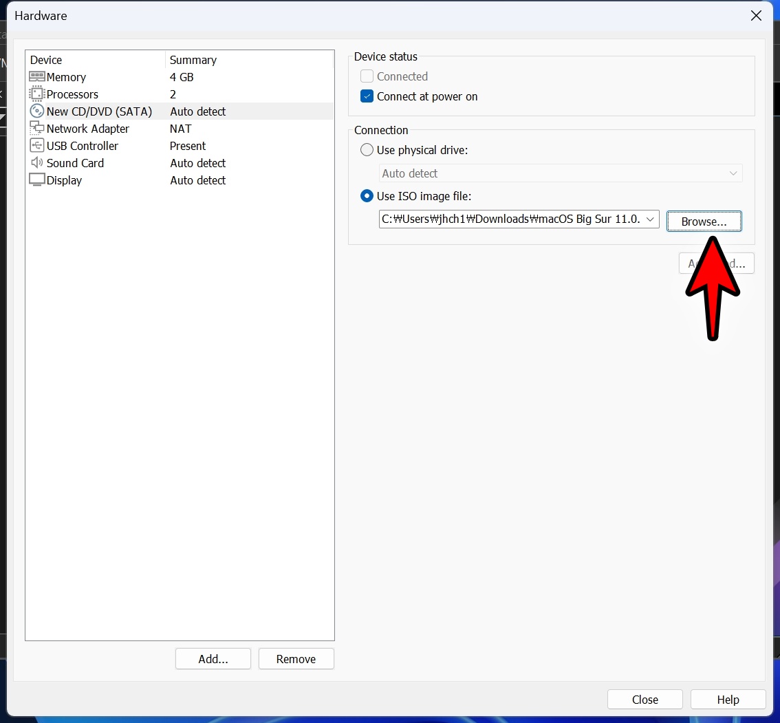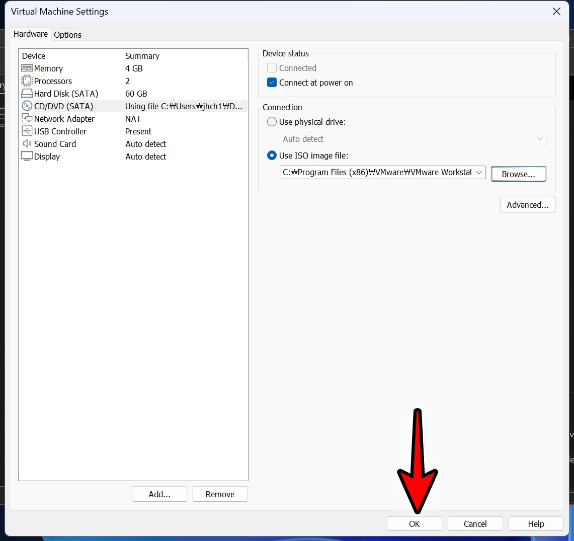 CD/DVD탭에서 ISO파일을 선택하고 Close을 입력합니다.