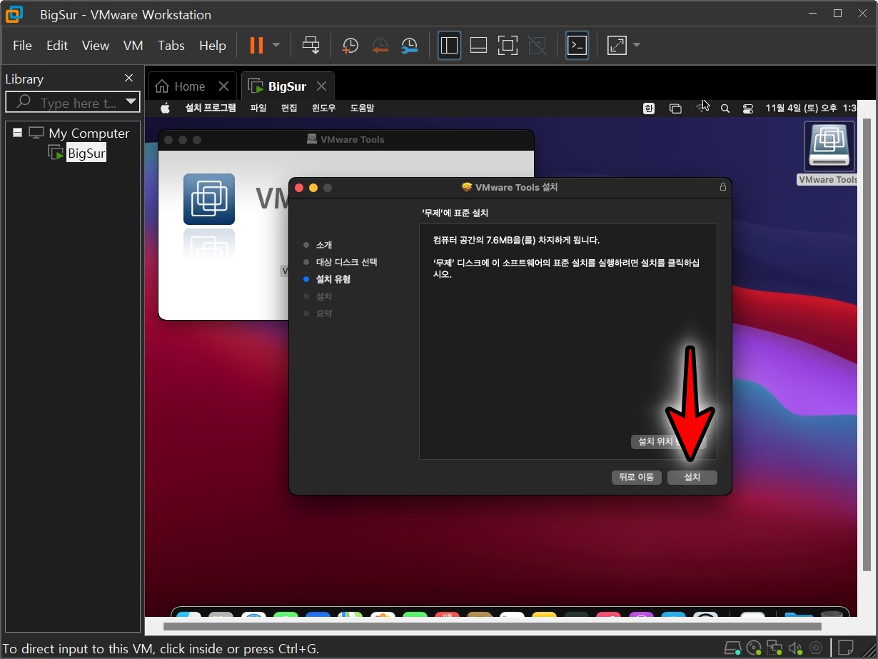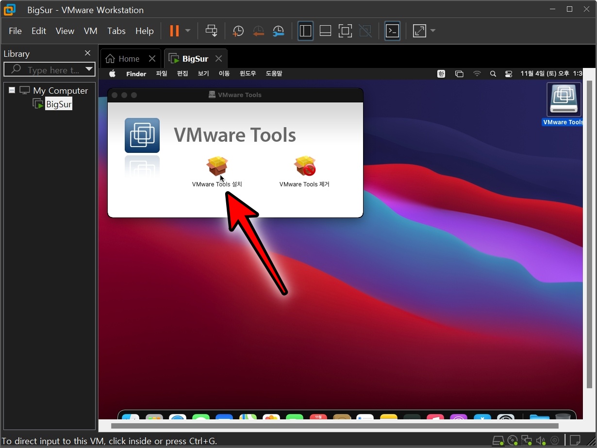 창에 뜨는 VMware Tools 설치 를 실행합니다.