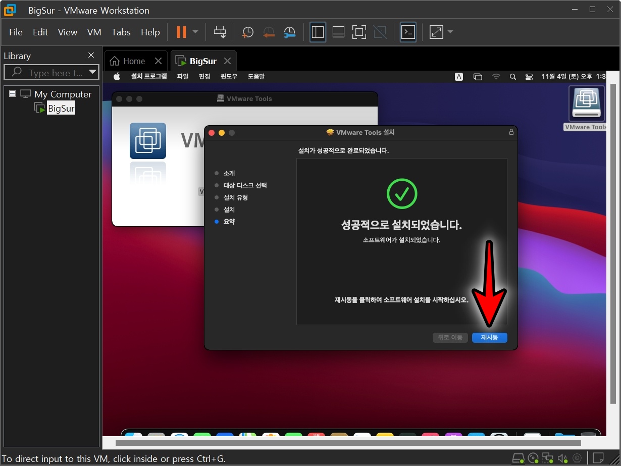 설치가 끝났으면 재시동 을 클릭해서 맥을 재시작합니다.