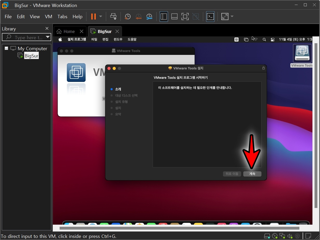 Big sur 설치를 시작합니다. 안내에 따라 설치를 진행합니다.