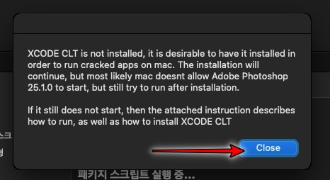 설치 중에 XCODE...메시지가 뜹니다. 무시하고 Close를 클릭합니다.