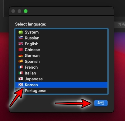 사용할 언어를 선택합니다. 원하는 언어를 선택하고 확인 을 클릭합니다.