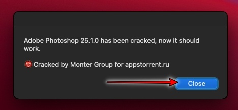 포토샵 2024 크랙이 완료되었다는 메시지가 뜹니다.(자동크랙) close을 클릭합니다.