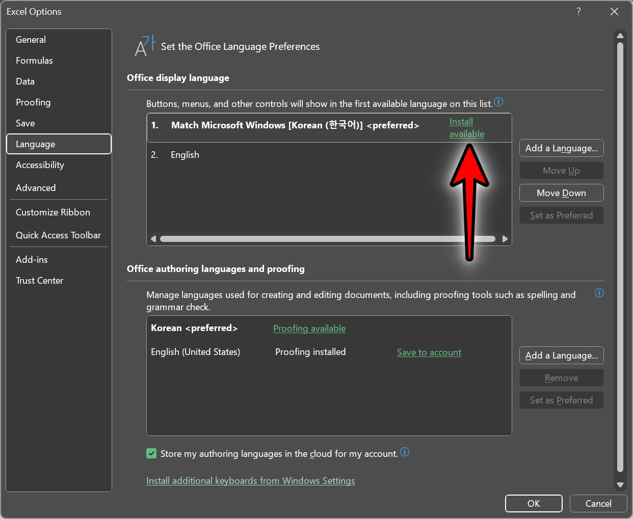 Language 탭에 있는 Match Microsoft Windows [Korean(한국어)] <preferred> 에 있는 Install available 을 클릭합니다.