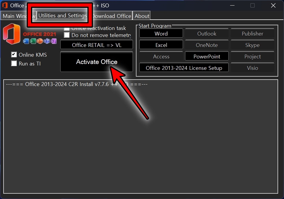 오피스 2024 설치 프로그램을 실행하고 Utilities and Settings 탭으로 간 후, Activate Office를 클릭합니다.