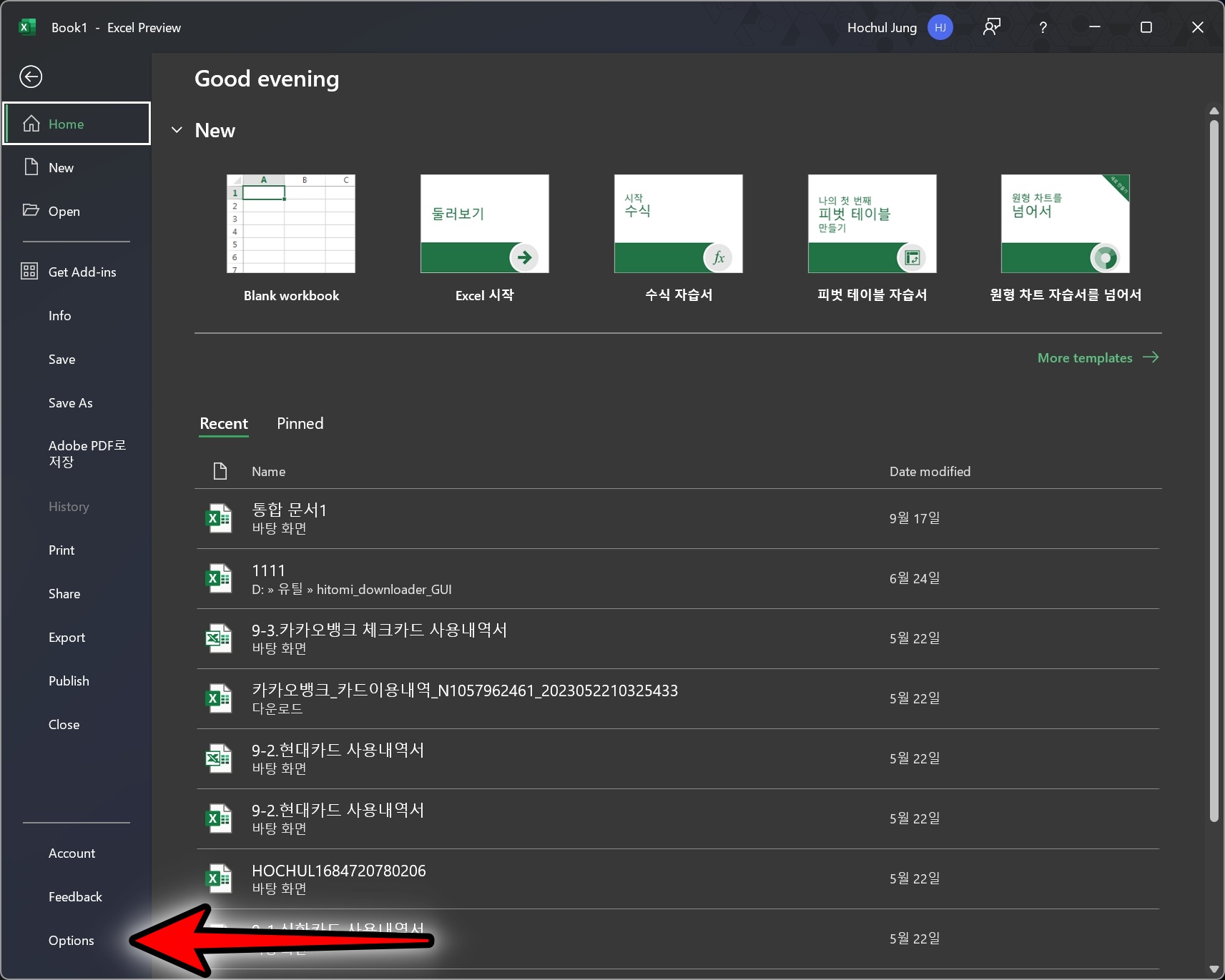 Home 탭에 있는 Options 를 클릭합니다.