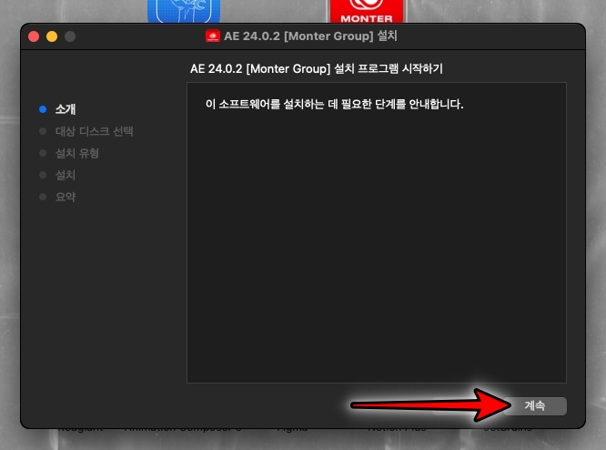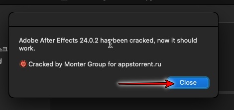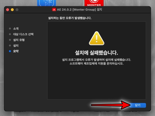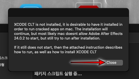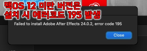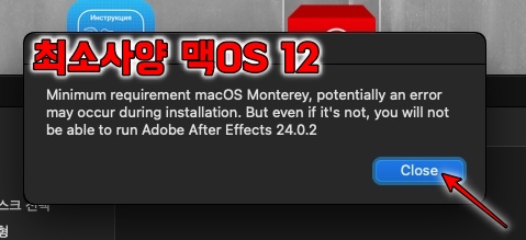 애프터이펙트 2024 맥 버전은 맥OS 12 이상에서만 실행 가능합니다. close를 클릭합니다.