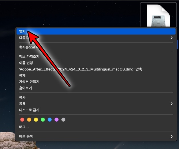 다운받은 Adobe_After_Effects_2024_v24_0_2_3_Multilingual_macOS.dmg 파일을 실행합니다.