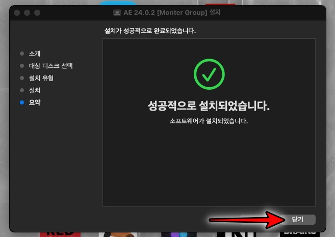 업데이트 하고 다시 애프터이펙트 2024를 설치하니, 정상으로 설치가 진행됩니다. 애프터이펙트 2024 크랙은 자동으로 적용됩니다. close를 클릭합니다.