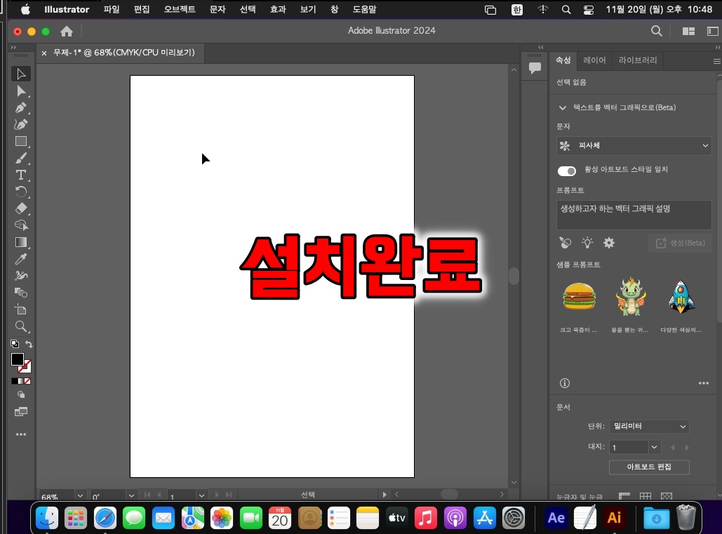 일러스트 2024 맥 버전 설치가 끝났습니다. 확인 을 클릭합니다. 이후 설치가 제대로 되었는지 확인하기 위해 일러스트 2024 를 실행합니다.