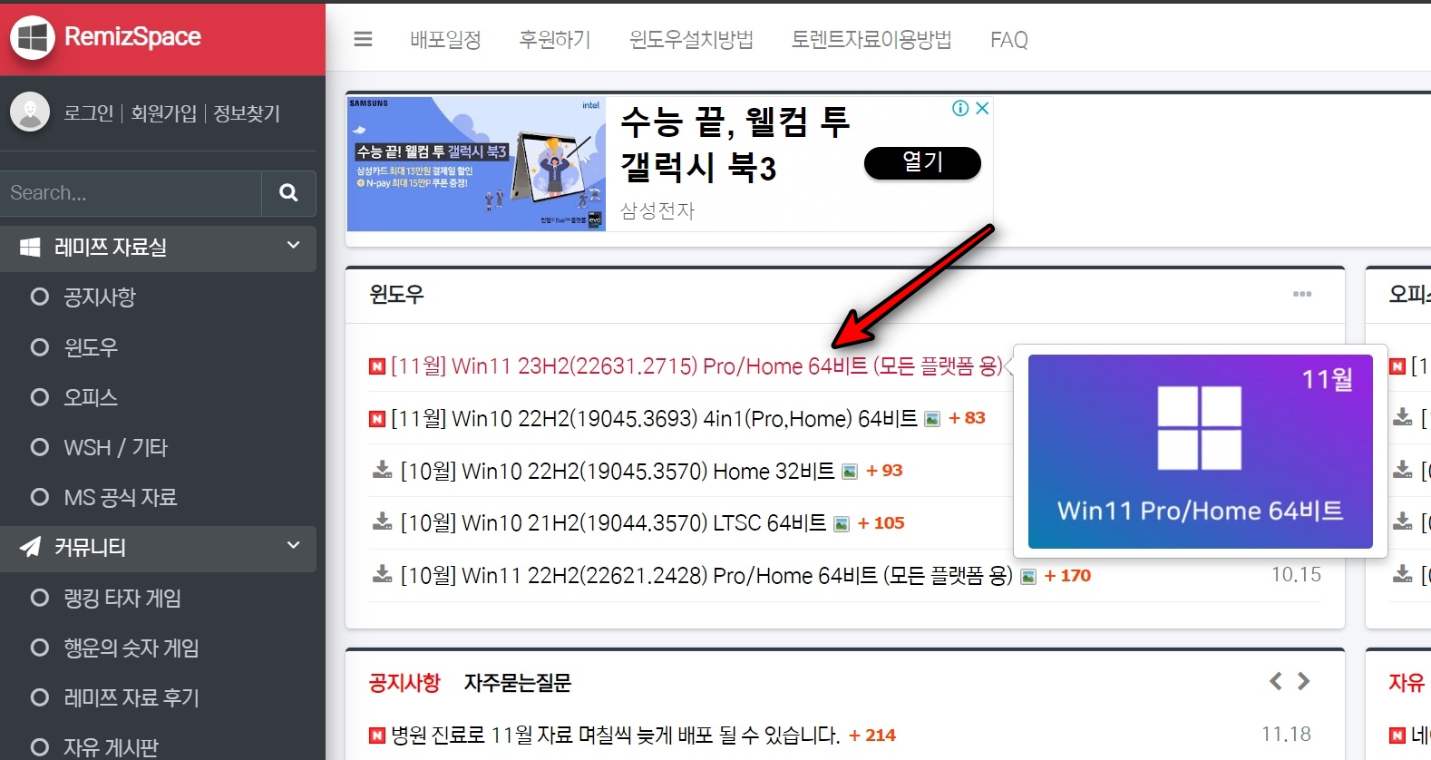 윈도우 11은 Remiz 님 홈페이지에서 다운받았습니다. 아래 링크를 클릭합니다.