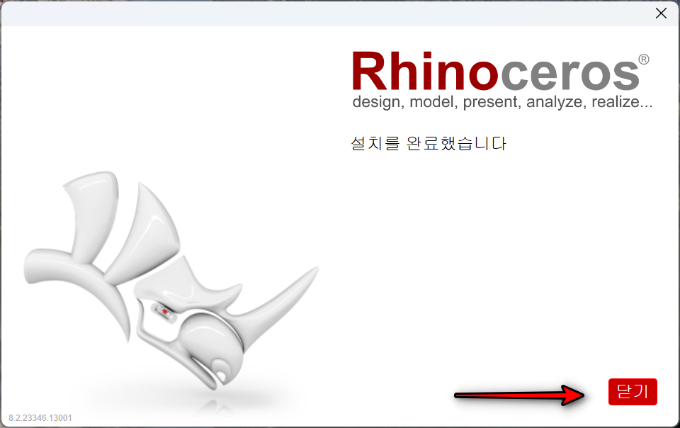 라이노 8 설치가 끝났습니다. 닫기를 클릭하고 라이노 8 크랙 설치를 시작합니다.