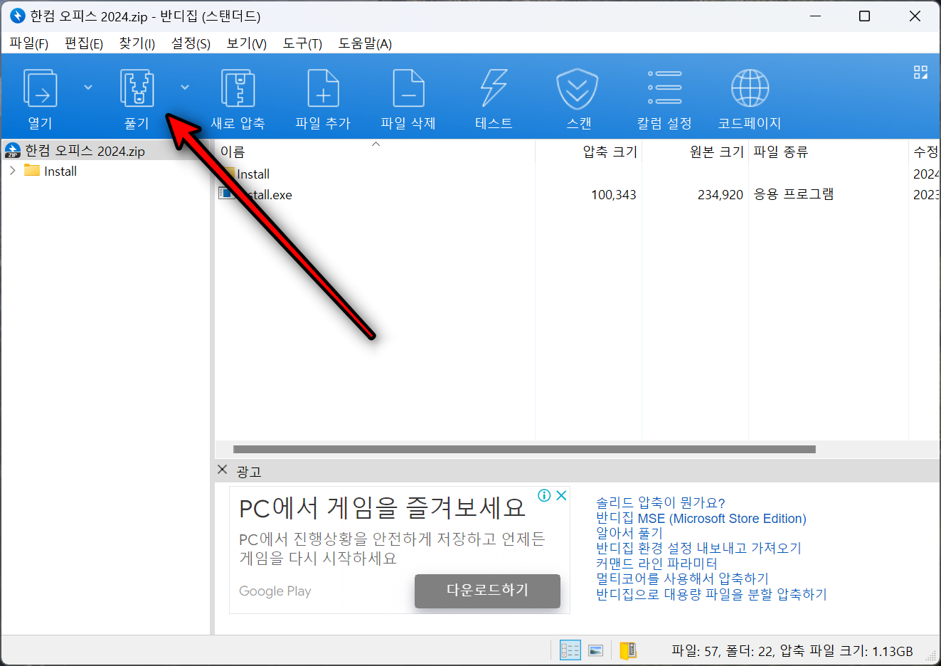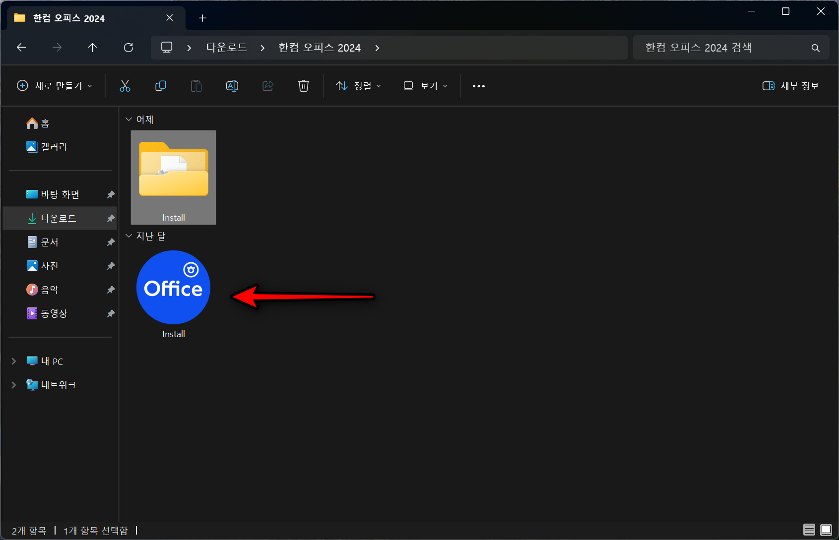 파일 다운로드가 끝나면 한글 2024 설치를 시작합니다.