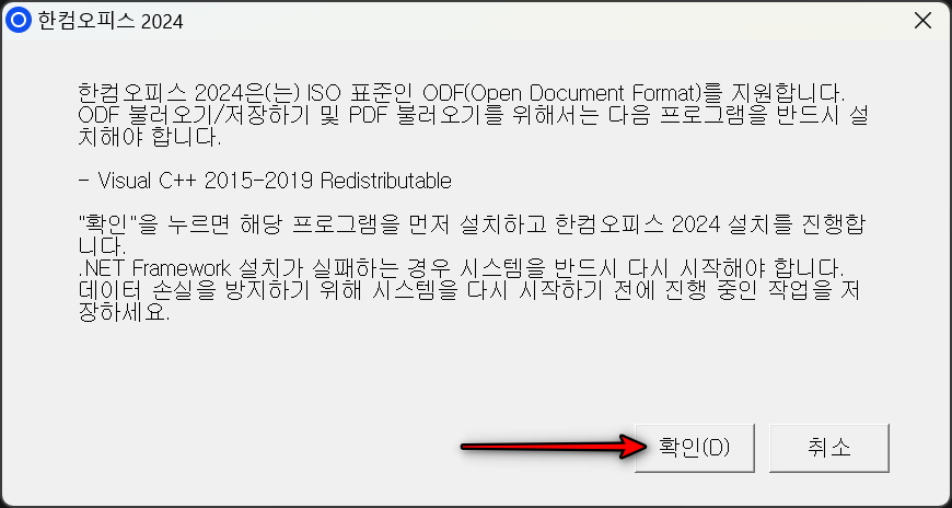 한글 프로그램을 사용하려면 Visual C++이 필요합니다. 확인 을 클릭해서 프로그램을 설치합니다.