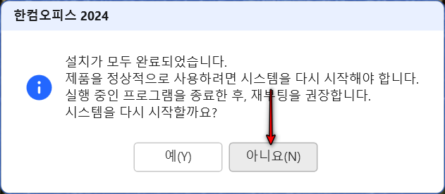 재시작은 굳이 필요하지 않으므로 아니오 를 클릭합니다.