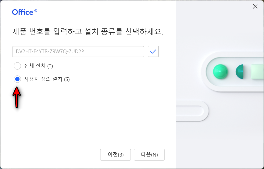 제품 번호는 자동으로 입력되어 있습니다. 사용자 정의 설치 를 체크하고 다음 을 클릭합니다.