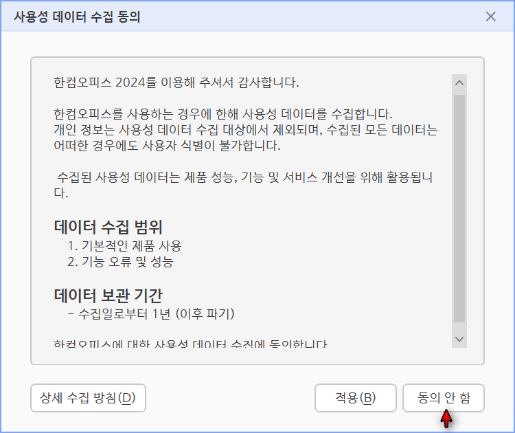 데이트 수집 동의 창입니다. 동의 안함에 체크합니다.