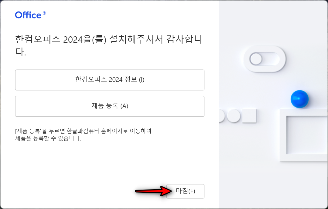 설치가 끝났으면 마침 을 클릭해서 한글 2024 설치 프로그램을 종료합니다.