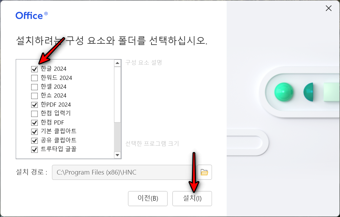 여기서 설치할 프로그램을 선택할 수 있습니다. 한글 2024만 필요하므로, 나머지 프로그램은 체크 해재하고 설치 를 클릭하면 한글 2024 설치를 시작합니다.