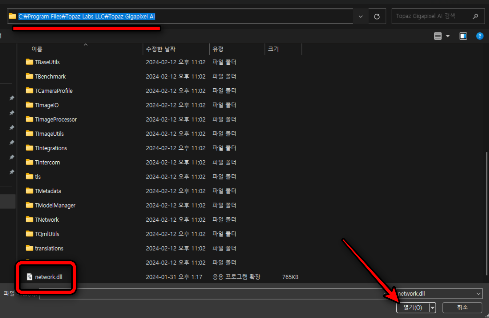 network.dll 파일을 찾아야 합니다. C:\Program Files\Topaz Labs LLC\Topaz Gigapixel AI 경로로 가서 파일을 선택 후 열기 를 클릭합니다.